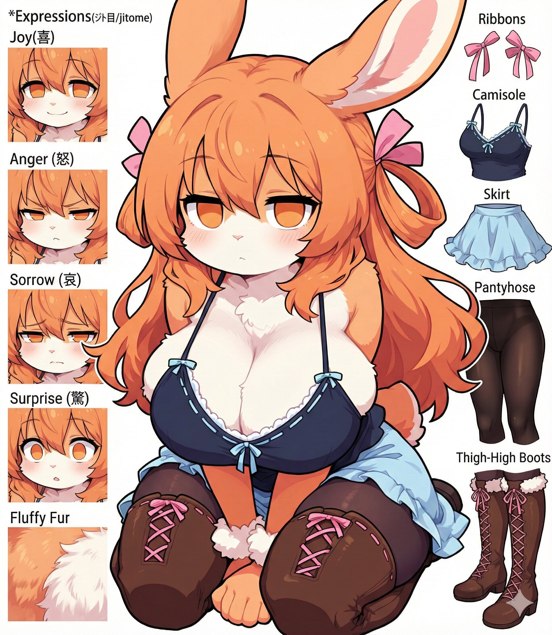 solo,short female,oppai loli,(rabbit girl),(furry female),orange fur,fluffy body fur,stand fur,orange rabbit ears,rabbit nose,orange rabbit tail,huge breasts,wide hips,thick thighs,orange hair,long hair,hair rings,pink ribbons,hair between eyes,orange eyes,round eyes,no pupils,layering,black camisole,blue ribbon-trimmed camisole,light-blue skirt,wide A-lines,black pantyhose under clothes,brown thigh boots,boots over pantyhose,expressionless,unemotional,seiza,deep skin,skindentation,disembodied hand,headpats,speed lines,motion blur,motion lines,motion trail,afterimage,smear frame,looking ahead,from front,three quarter view,foreshortening,perspective,saturated,smooth,dramatic angle,white floor,white background,simple background,(low contrast:1.2),softy,(2D),(stylized),(kawaii),(cute),(anime coloring),furry,(two tone fur),(furry body),perfect body,detailed face,high quality,cute clothes,animal tail,animal ears,solo,masterpiece,seductive mischievous expression,eductive demeanor,((correct_anatomy)) イラストのキャラクターをGペンでペン入れする。2D。カラー。強めの影とコントラスト。線は細く薄くする。フラット。バストとヒップが豊満。キャラクターの特徴をそのままに、ポーズを完全に変更。腰が細い。背が低い。柔らかくフワフワの体毛。瞳孔が無くフラットな色の瞳。ジト目をベースとした喜怒哀驚の感情と、キャミソールや小物などを載せたキャラクターシートを作成。画像では、キャラクターの全身デザインを中央に配置。分解された要素を中央のキャラクターの周囲にきちんと配置。キャラクターの衣装を、リボン、キャミソール、スカート、パンティストッキング、サイハイブーツと、個々に分解。デザインと素材の詳細に焦点を当て、個別に表示。黒タイツの質感向上。喜の感情は、ジト目で口角を少し上げるだけ。怒の感情は、半目になるだけ。哀の感情は、困り眉になるだけ。驚の感情は、目を少し大きく開けるだけ。グラデーションを追加し、ブラシ塗りにする。柔らかく暖かみのあるタッチの塗り。