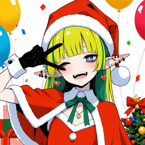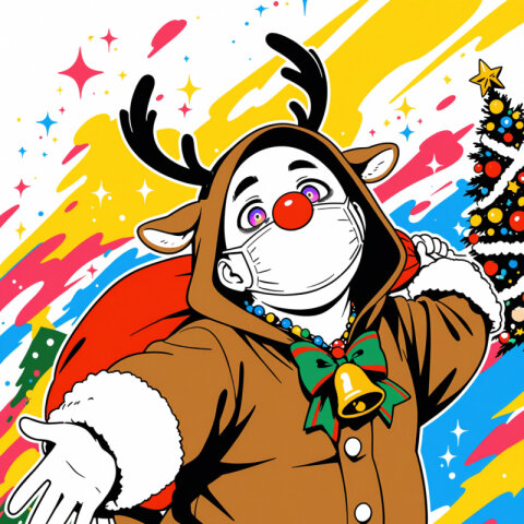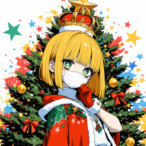 santa-inspired kimono top, red upper garment, fluffy white trim, soft moco-moco texture, festive fabric patterns, ribbon ornaments, bell accessories, green hakama pants, Snowflake pattern hakama pants, wide pleated hakama, warm and cute christmas japanese style,Reindeer antler headband,geta,