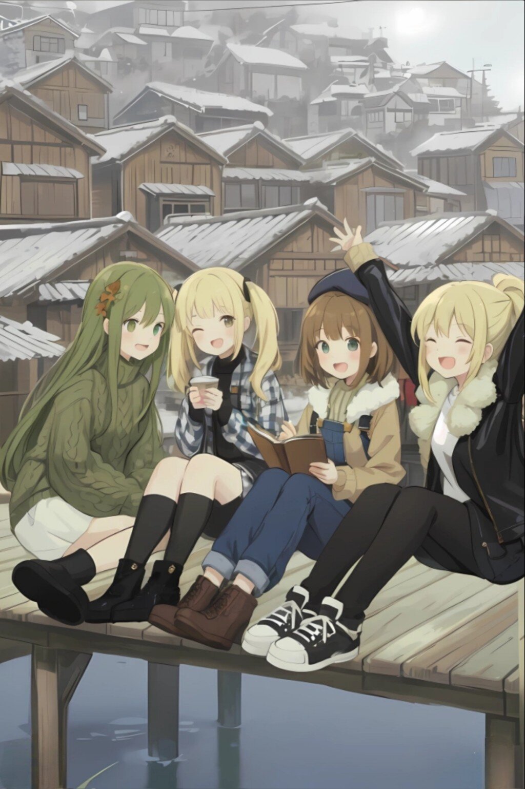 Four anime-style girls, depicted in a warm and inviting light, sitting on a wooden dock with a charming village in the background. From left to right: The first girl has long green hair, is wearing a cozy green sweater and white pants, and is smiling with her eyes closed. The second girl has blonde pigtails, is wearing a black and white plaid jacket with a dark top, and is holding a cup while smiling. The third girl has short brown hair with a beret, is wearing a beige jacket over blue overalls, and is holding an open book, looking at it with a gentle smile. The fourth girl has blonde hair, is wearing a black leather jacket with a white top and black pants, and is raising one arm in an excited gesture with a wide smile. The village behind them features traditional-style houses with dark roofs, suggesting a slightly cool or wintery setting. The overall mood is cheerful and friendly, with a hint of adventure.
