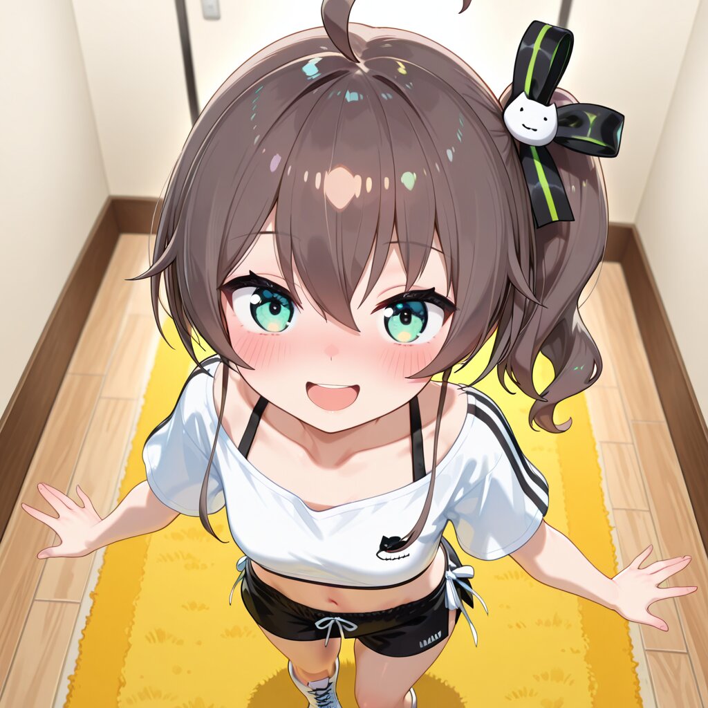 <lora:natuiro maturi:1>looking at viewer, very blush, bangs, brown hair, shirt, hair ornament, ribbon, navel, hair between eyes, green eyes, collarbone, full body, hair ribbon, white shirt, ahoge, short sleeves, boots, shorts, alternate costume, midriff, virtual youtuber, medium hair, side ponytail, crop top, black ribbon, black shorts, white footwear, cross-laced footwear, cat hair ornament, natsuiro matsuri, dance lesson room, very blush, open mouth, mesugaki smile, (((birds eye view))),