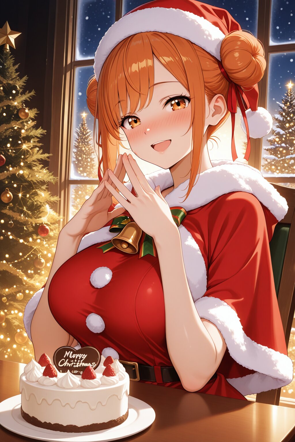 1girl, night:1.3,dark theme,Christmas,backlighting,window,snow,dining room,christmas_tree, large breasts, orange hair,(double bun),(parted bangs:1.3),sideburns,hair side red string ribbon,swept bangs,center flap bangs, small orange eyes, nose blush,naughty smile,open mouth,happy,joy,delicious, santa dress,santa hat,santa kneehighs,santa cape,bell, sitting on chair,christmas cake on table,hands up, upper body,dynamic angle,looking at viewer,from side:0.8, ((best quality)),amazing quality,((very high resolution)),very aesthetic,((ultra detailed)),absurdres, full color,extremely detailed CG,super fine illustration, perfect anatomy,perfect hands,super detailed skin, (beautiful eyes,detailed eyes,perfect eyes,eye reflection),high-quality face,extremely detailed face, anime style,