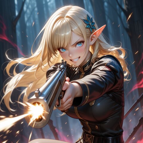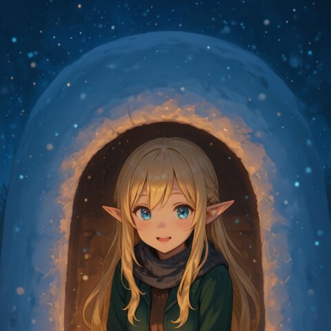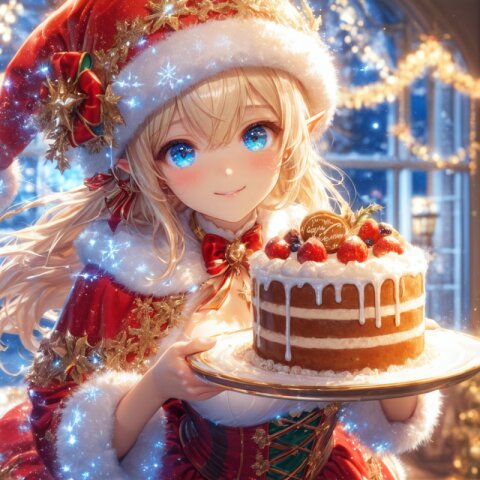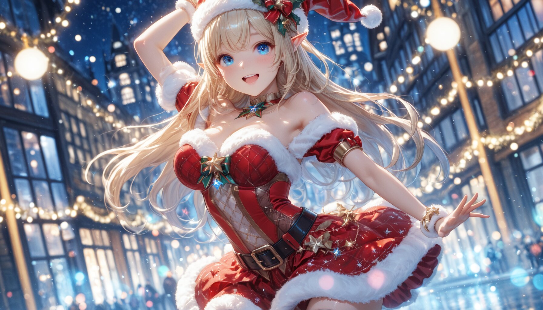 An illustration that looks like a movie poster. A dynamic composition and scene like the final scene of a movie. Official art. A semi-realistic, moe heroine in the style of Japanese anime. A blonde, blue-eyed elf girl wearing a fantastical Santa Claus costume made up of sparkling lights and light particles. She is dancing rhythmically and happily. She looks at me with a lovely smile. The background is a sparkling city decorated for Christmas. ((Countless light particles floating around:1.4)), ultra detailed lips, ultra detailed face and hair, beautiful eyes, kawaii, adorable, cute, elf girl, (apatite eyes with CGI Effect), (deep blonde hair:1.2), medium breasts, wide hip, volumetric lighting, sfw:1.2. front light:1.2., masterpiece, amazing quality, very aesthetic, high resolution, ultra-detailed, absolute, newest, 2d, semi-realistic, moe heroine, sharp focus,, anime style, anime color,, <lora:elf-san_alpha1(AnimagineV31):0.7> <lora:elf-san_alpha4(IL1.0):0.7>