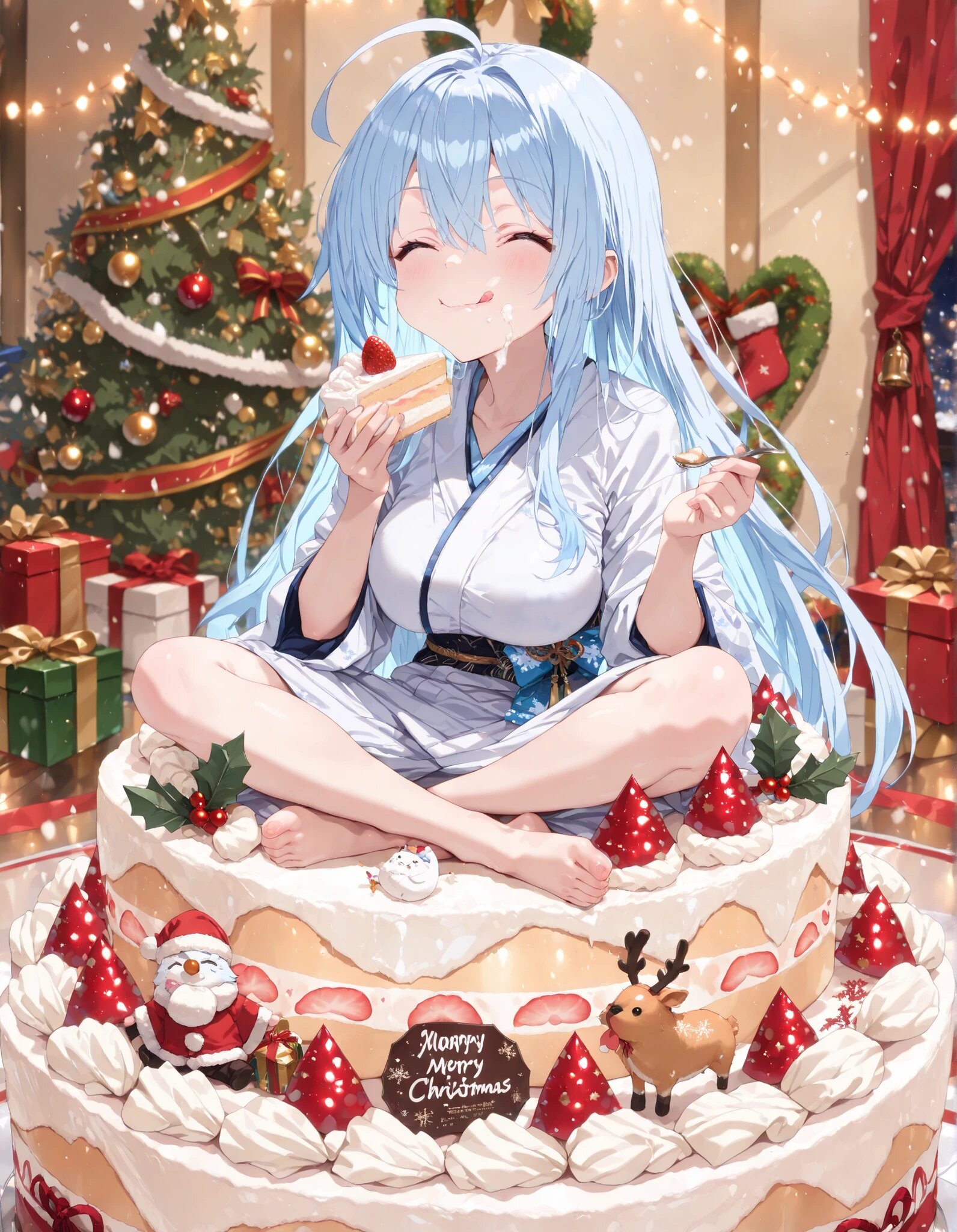 dynamic lighting,christmas party,1girl,solo,(sitting on giant christmas cake),light blue hair,long hair,ahoge,happy smile,closed eyes,:q,licking lip,white cream on face,indian style sitting,simple white kimono,large breasts,eating the cake,((masterpiece, best quality, extremely detailed, absurdres)),