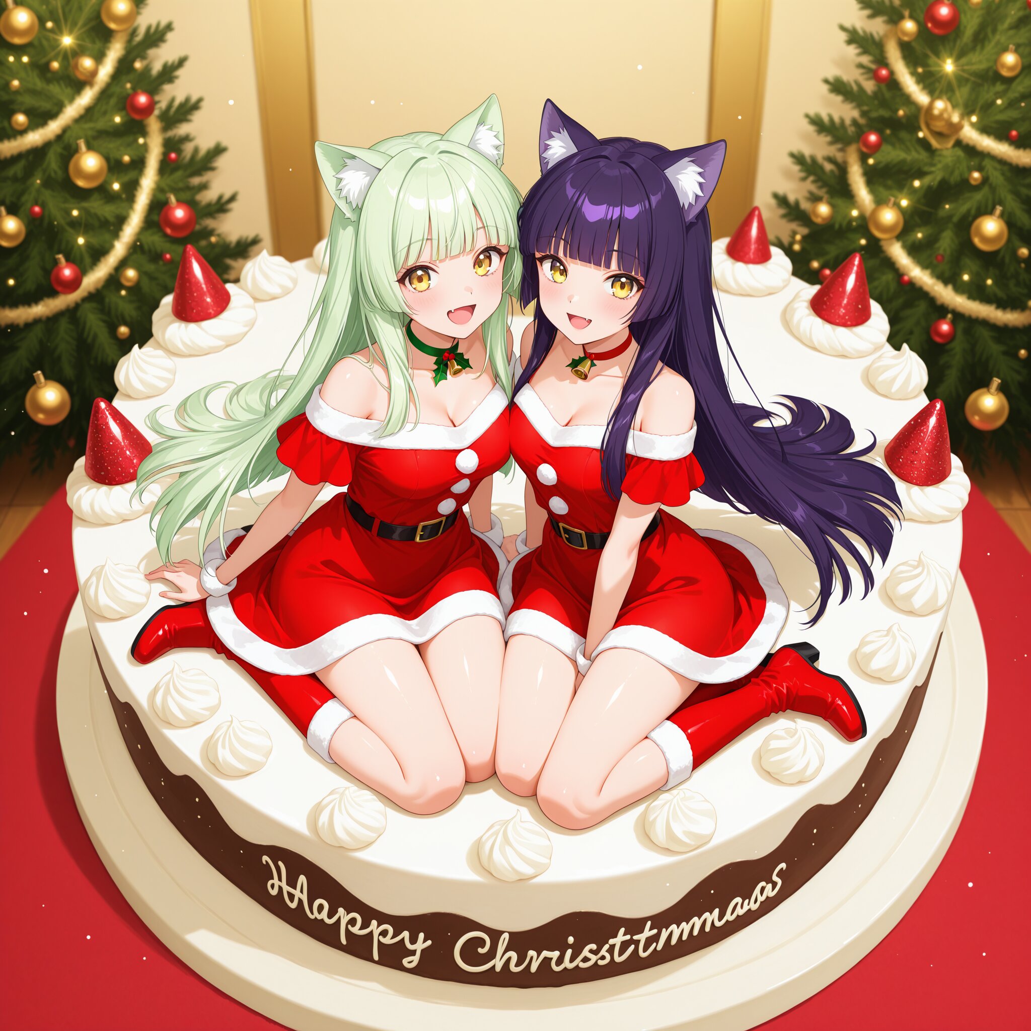 (anime-style illustration:1.5), (2girls:1.2), (light green hair:1.2), (dark purple hair:1.2), (yellow eyes:1.2), (light green cat ears:1.2), (dark purple cat ears:1.2), happy, fang, (whitening), (long hair), (shiny hair), (hime cut), christmas ornament, idol, (santa dress:1.5), cleavage, choker, (christmas cake:1.5), (full body), (cake portrait), floating, lying, looking at viewer, fantasy, land of sweets, side-by-side, pastel background, blurry background, fading border+christmas border,