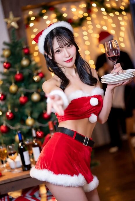 A realistic photo of a 25-year-old Japanese woman visiting a room during a Christmas party, dressed in a mini-skirt Santa outfit, posed in a gravure photography composition, with the quality and finish of a professional photographer's work. She is holding dishes, party goods, and a wine glass, inviting with a seductive gesture to enjoy the party together.