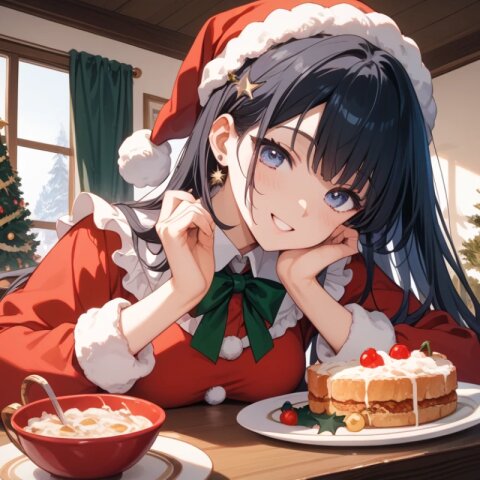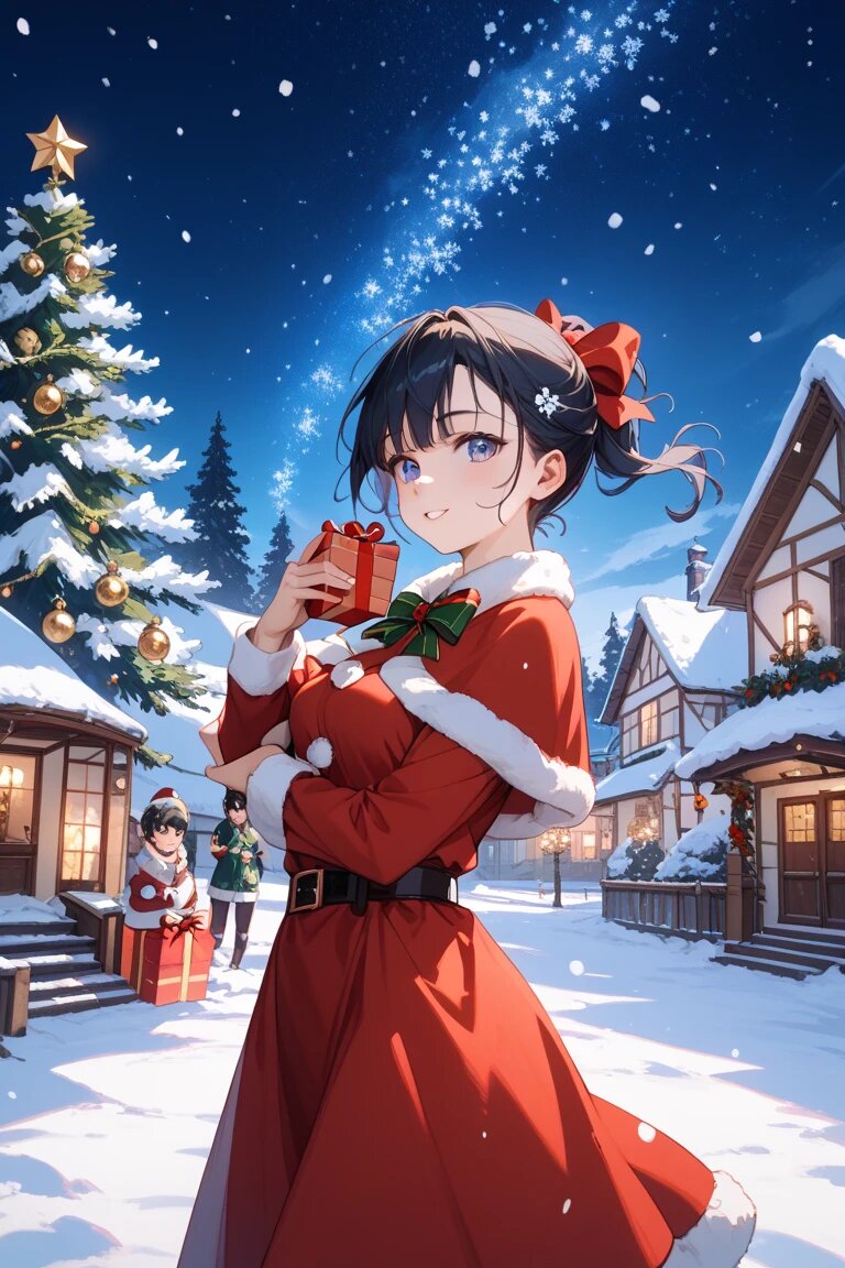 夜の冬の雪原に立つ大きなクリスマスツリー。ツリーの前に立つサンタクロース姿の若い女性。デコルテを強調したサンタクロース衣装、彼女は黒髪を二つに結び、大きなクリスマスプレゼントの包を持ってサンタクロース姿で優雅なポーズをとっている。。粉雪が風に乗って周囲に舞う。油絵のような柔らかな冬景色。冬の夜景。奇麗に飾られたクリスマスツリー。夜景に映えるクリスマスツリー。 夜の冬の雪原に立つ大きなクリスマスツリー。ツリーの前に立つサンタクロース姿の若い女性。デコルテを強調したサンタクロース衣装、彼女は黒髪を二つに結び、大きなクリスマスプレゼントの包を持ってサンタクロース姿で優雅なポーズをとっている。。粉雪が風に乗って周囲に舞う。油絵のような柔らかな冬景色。冬の夜景。奇麗に飾られたクリスマスツリー。夜景に映えるクリスマスツリー。