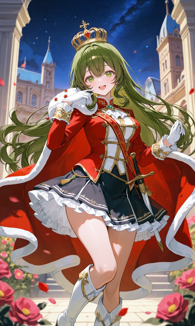 A stunning young woman with olive-green, very long hair that cascades down her back, with strands delicately framing her face between her eyes. She has large, round green eyes that sparkle with life, set in a beautiful and delicate face with flawless, detailed skin. She wears an extravagant (luxurious Red Prince costume with white trim:1.6) with intricate embroidery, paired with a (luxurious Navy mini skirt with white frill:1.4) and (White luxurious gloves:1.2). A (luxurious Red Cape:1.3) flows dramatically behind her, and she sports a (luxurious crown on head:1.4) adorned with jewels. A (dagger on waist:1.3) rests at her hip, completing her princely ensemble. Her (luxurious White Boots:1.3) add to her regal stature. She strikes a cute pose, smiling cheerfully with her mouth slightly open, radiating charm and confidence. The scene is set outside a grand Palace with Baroque architecture, surrounded by blooming flowers under a starry night sky. Romantic academia atmosphere permeates the air, with a soft dust effect adding magic to the composition. The artwork is a masterpiece with insanely detailed textures, intricate designs, and best quality rendering in an absurd resolution.