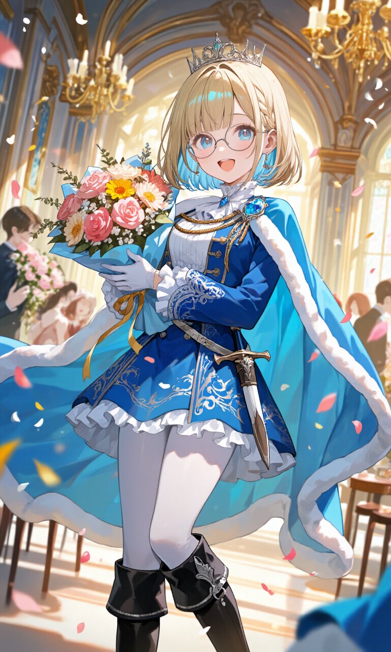A 17-year-old girl with a chic bob cut, featuring blonde hair and subtle light blue inner highlights, wears round glasses that complement her bright blue eyes. Her face is meticulously detailed with soft, flawless skin and a charming, cute expression. She is dressed in an extravagant (Blue luxurious Prince costume:1.5) with intricate embroidery, long flowing sleeves, and a (Light Blue luxurious Cape:1.3) that drapes elegantly over her shoulders. The outfit includes a (luxurious Blue mini skirt with white frill:1.3), (Black luxurious boots:1.3), and a (dagger on waist:1.3) for a regal yet playful touch. A (luxurious crown:1.3) rests atop her head, and she wears (luxurious White gloves:1.2) along with sheer white tights. She holds a (holding a bouquet in hand:1.5) of vibrant flowers, beaming with happiness in a grand Rococo-style ballroom adorned with gilded arches, chandeliers, and lavish floral arrangements. The scene is set in a palace with romantic academia influences, featuring dreamy (soft lightings) and a (light atmosphere). She is (surrounded by friends:1.8), all dressed in elegant attire, celebrating her birthday amidst cascading petals and delicate (bloom) effects. The composition exudes a fairytale-like, insanely detailed aesthetic with a focus on textures, fabrics, and the warm glow of candlelight.