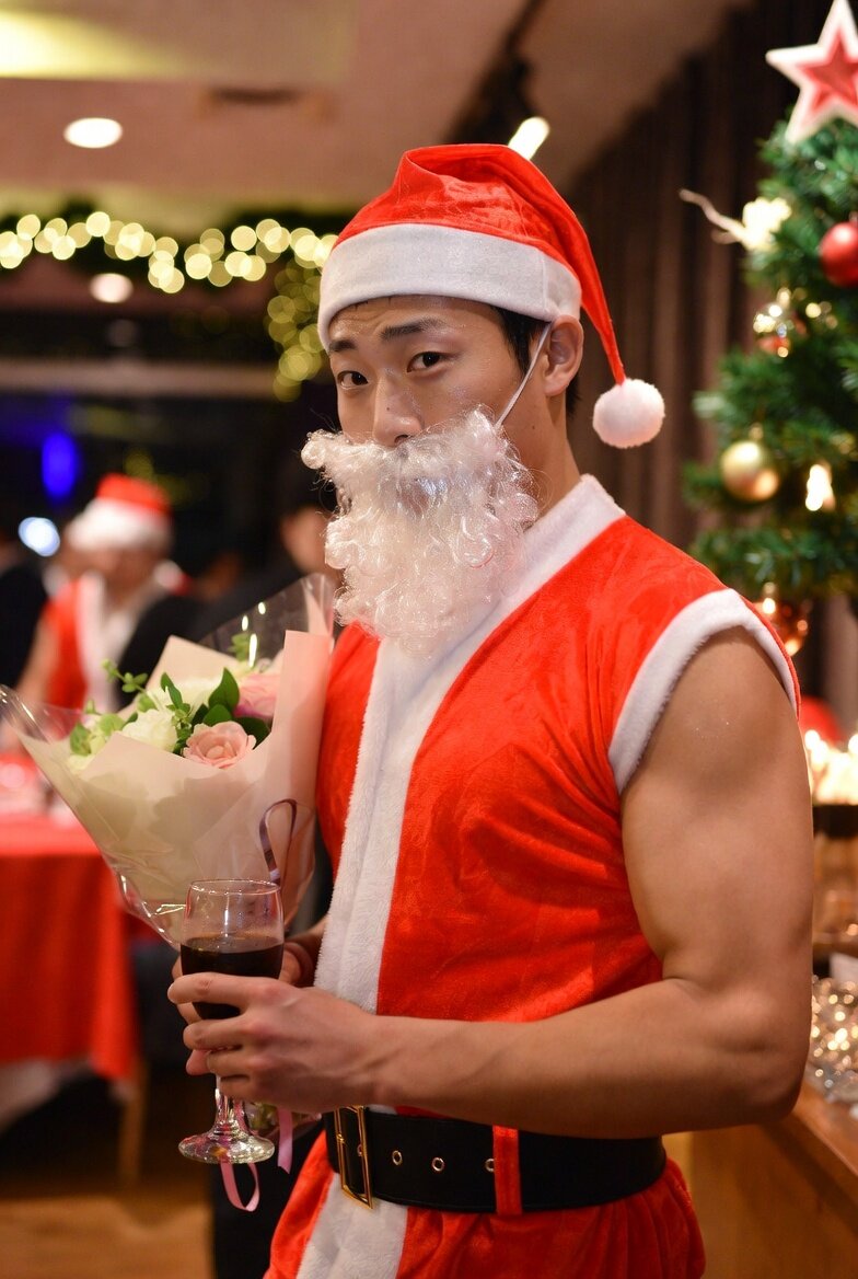 日本人男性25歳。サンタクロースに扮装している。白い付けひげ。パーティー会場に花束やドリンクなどを持ってきている。