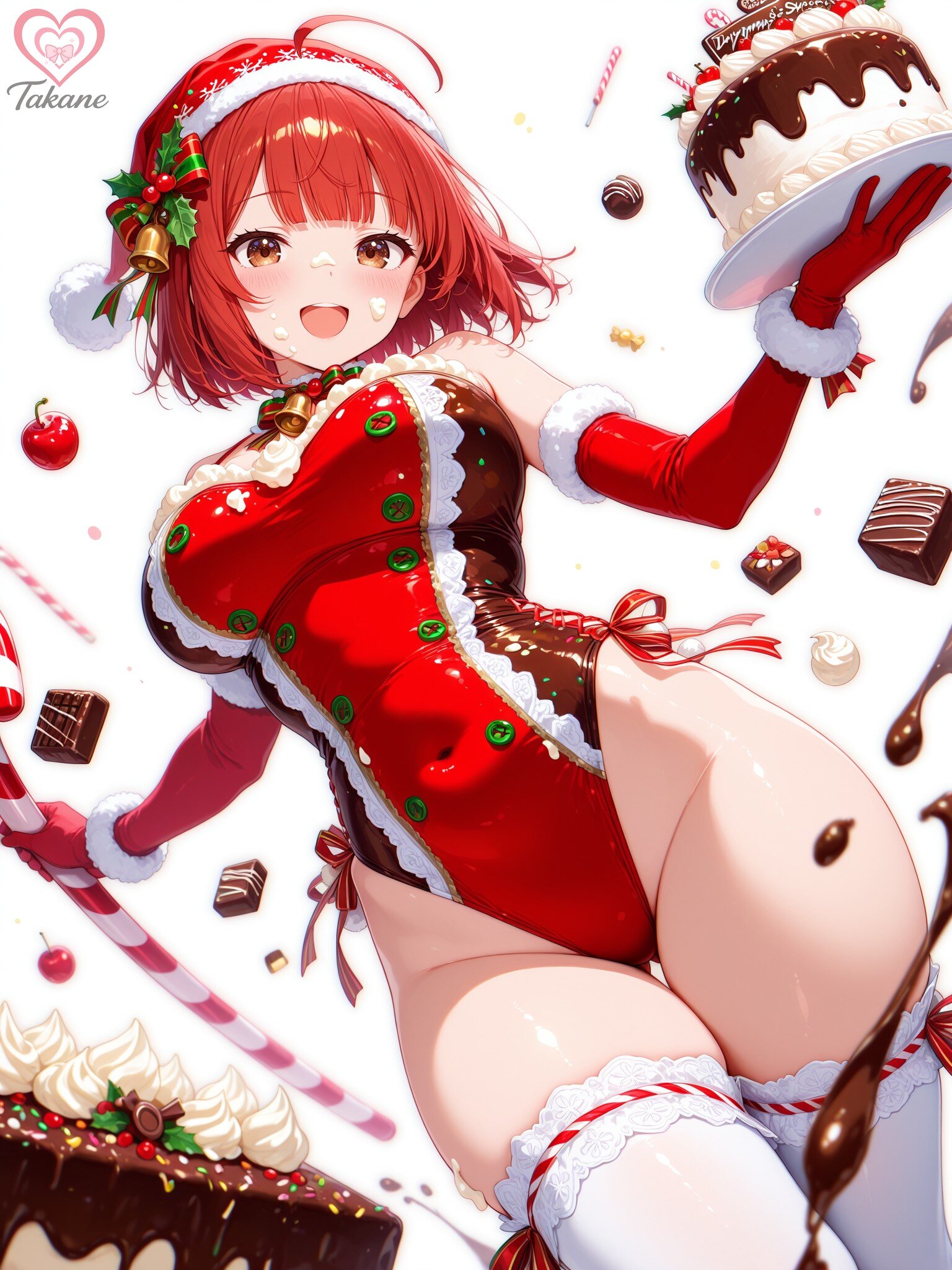 holding a Christmas cake,holiday sweets high-leg swimsuit, glossy chocolate brown with cream gradient top, cream frosting piping swirls on chest/hips, candy cane side stripes, cookie gingerbread charms jingle bells on straps, dense sprinkle sequins, white fur trim edges, red cherry bow chest with holly, ribbon candy back lacing,