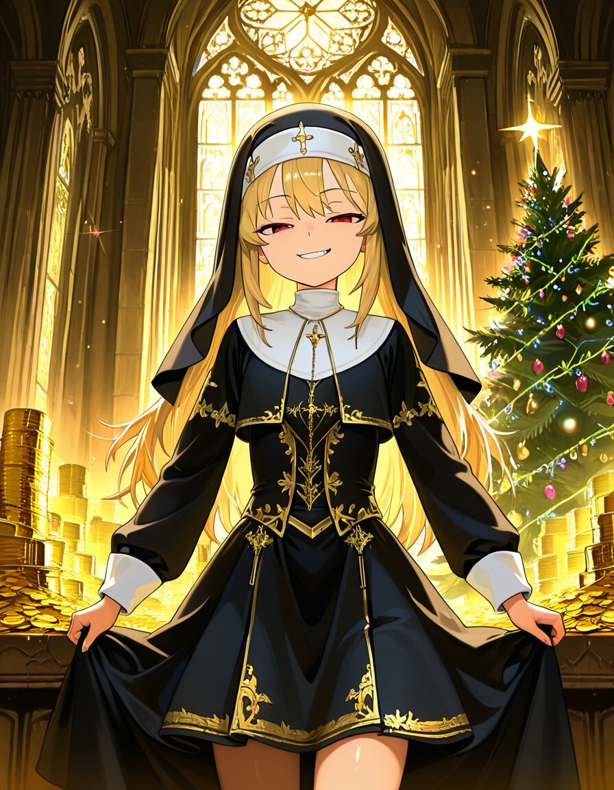 masterpiece, best quality, anime style, petite youthful-looking adult nun woman, small stature, slender petite body, short height, ambitious blonde long hair, confident greedy expression, sly grin, smirk, narrowed eyes, black-themed mini-skirt nun outfit with luxurious gold embroidery, deep black fabric, intricate gold thread embroidery, absolute territory, night cathedral interior, grand gothic cathedral at night, stained glass windows dimly glowing, large decorated christmas tree inside cathedral:1.5, ornate christmas tree, glowing ornaments, gold and emerald decorations, christmas lights wrapped around the tree, christmas tree clearly visible behind her, primary light source from christmas tree, emerald green dominant lighting, green festive glow illuminating the scene, soft green light casting shadows, subtle golden highlights from reflections, green light reflecting on gold embroidery and gold coins, holding stacks of cash in her hands:1.5, bundle of banknotes, paper money, bills fanned out, money in foreground, banknotes clearly visible, mountain of gold coins at her feet, piles of gold coins reflecting green christmas lights, holy night sparkle theme, floating light particles, bokeh sparkles, green and gold color palette, prismatic light effects, cinematic lighting, soft glow, fantasy illustration, ultra-detailed shading