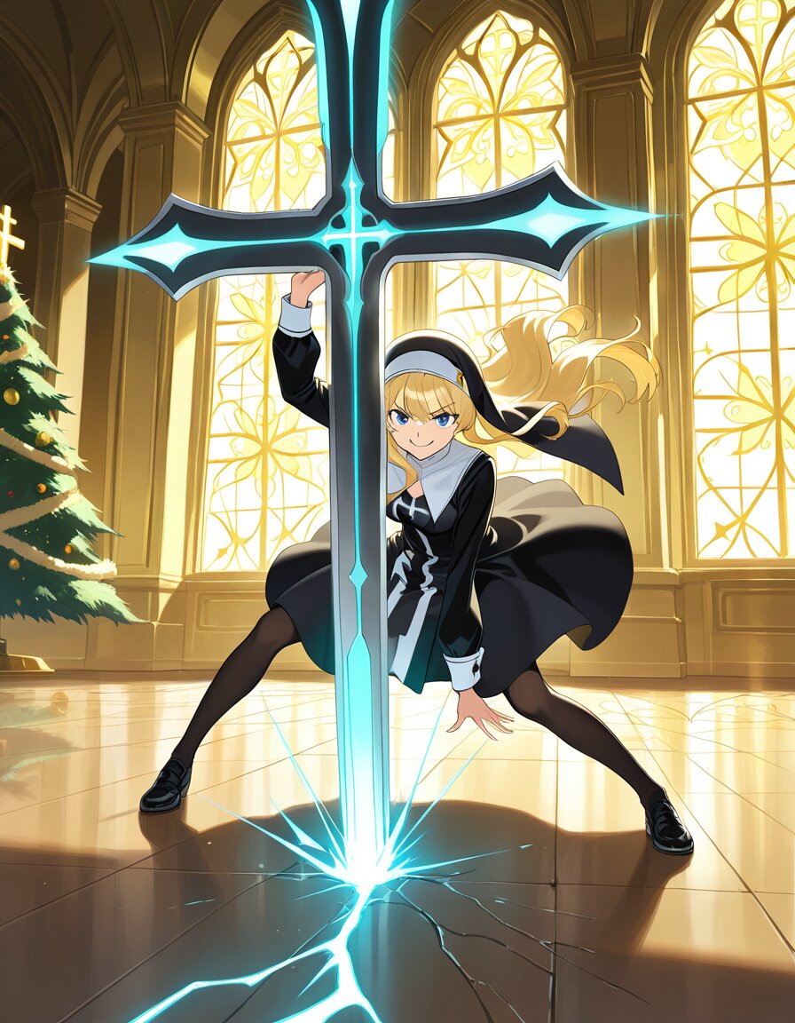(masterpiece, best quality, ultra-detailed, anime style, dynamic action pose, dramatic lighting), ambitious blonde nun girl, confident greedy smile, long wavy blonde hair, blue eyes, wearing a black-themed *mini-skirt* nun outfit with silver embroidery, absolute territory, tight glossy fabric, dynamic skirt fluttering with movement, (holding an oversized black and silver cross weapon with both hands:1.2), (slamming the massive cross down into the ground with full force:1.3), (impact point erupting with intense sacred light:1.5), (cross-shaped shockwave and vertical light pillar bursting upward:1.4), (golden sparks and glowing debris scattering across the ground), (magical sigils showing "《Crux Decisoria》—断罪十字衝" floating in the air), ruined cathedral interior, cracked stone floor, collapsed pillars, broken stained-glass windows letting in thin rays of light, dust and small particles floating, shadowy yet sacred ruin atmosphere, epic action moment, fierce expression, powerful impact scene