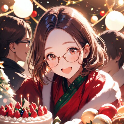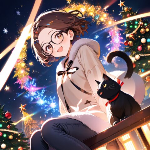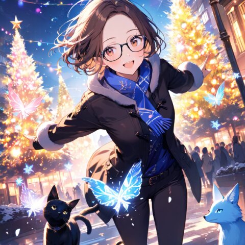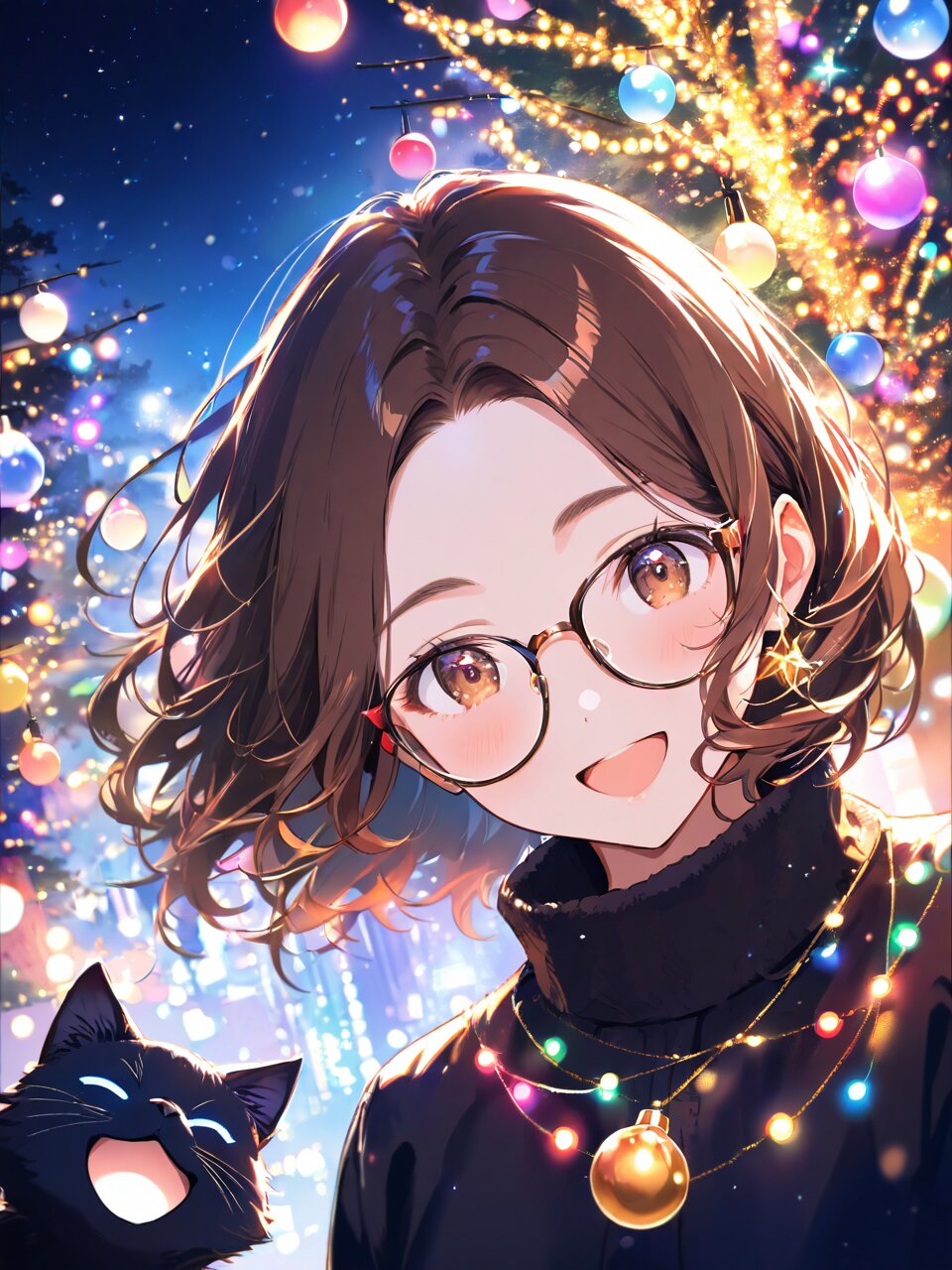 woman, forehead, glasses, brown hair, brown eyes, short hair, colorful highlight, street light, night, smile, Christmas tree, black cat, shining background, Scattering Light, happy, open mouth,