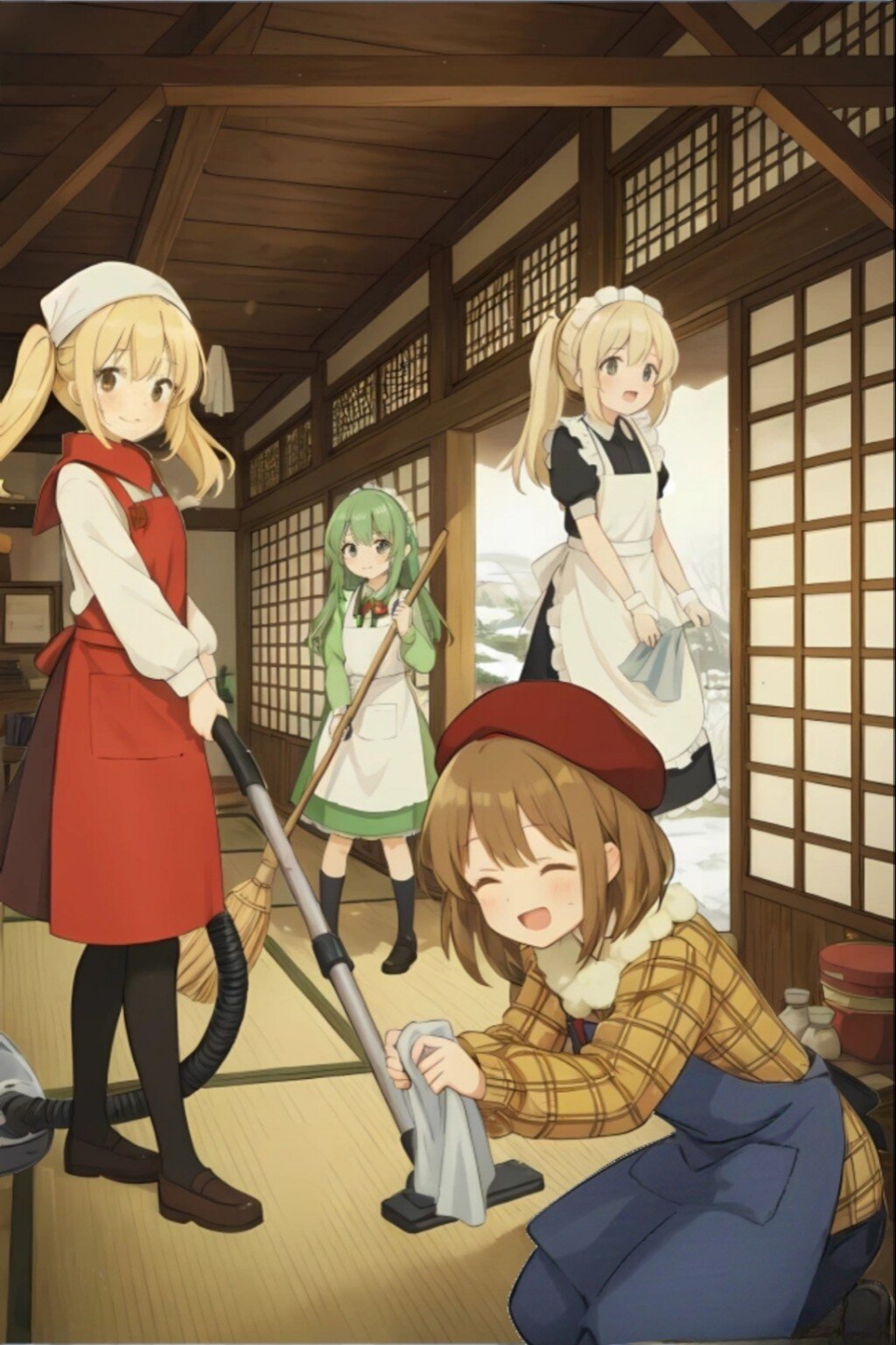 Four cute anime girls are enthusiastically cleaning a traditional Japanese-style room. The room has wooden floors and sliding shoji screens. One girl with blonde twin-tails and a white headscarf is on the left, wearing a red apron over a white long-sleeved shirt and black leggings, vacuuming the floor. In the background, a girl with long green hair tied back with a red ribbon is sweeping the floor with a straw broom. She is wearing a light green dress with a white collar and a white apron over it. Behind her, near the shoji screen, a blonde maid with twin-tails is wiping the screen. She is wearing a classic black and white maid uniform with a frilly white apron and headpiece, holding a white cloth. In the foreground on the right, a cheerful girl with short brown hair and a red beret is kneeling on the floor, happily wiping the floor with a cloth. She is wearing a yellow and brown plaid shirt under a dark blue apron. The overall atmosphere is warm, cozy, and diligent, with soft lighting filtering in from outside.