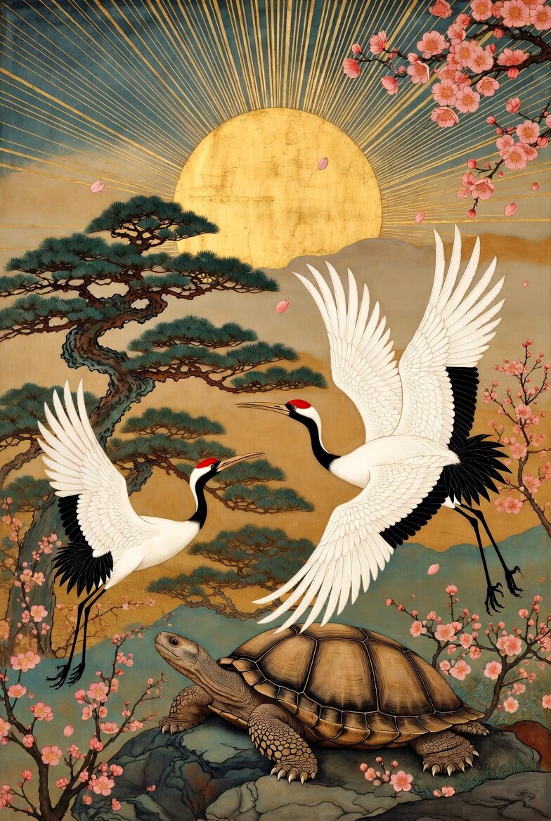 伝統的な日本画スタイルの掛け軸(掛軸)風イラスト、縦長構成。背景に大きな黄金色の初日の出(初日の出)と放射状の金色の光線が広がる穏やかな空。中景に枝を大きく広げた古い松の木、前景に夫婦の丹頂鶴が対称的に太陽に向かって優雅に飛ぶ姿(白い羽に黒のアクセント、赤い頭頂)。下部に岩の上に休む老亀。画面全体に淡いピンクの梅の花が散らばって舞う。長寿と新年の吉祥を象徴する静かで清浄な雰囲気。色調は金色、深緑、赤、柔らかいピンクを基調に、金箔のアクセントと細やかな筆致で豪華に。高解像度、詳細で優雅な伝統日本美術風。