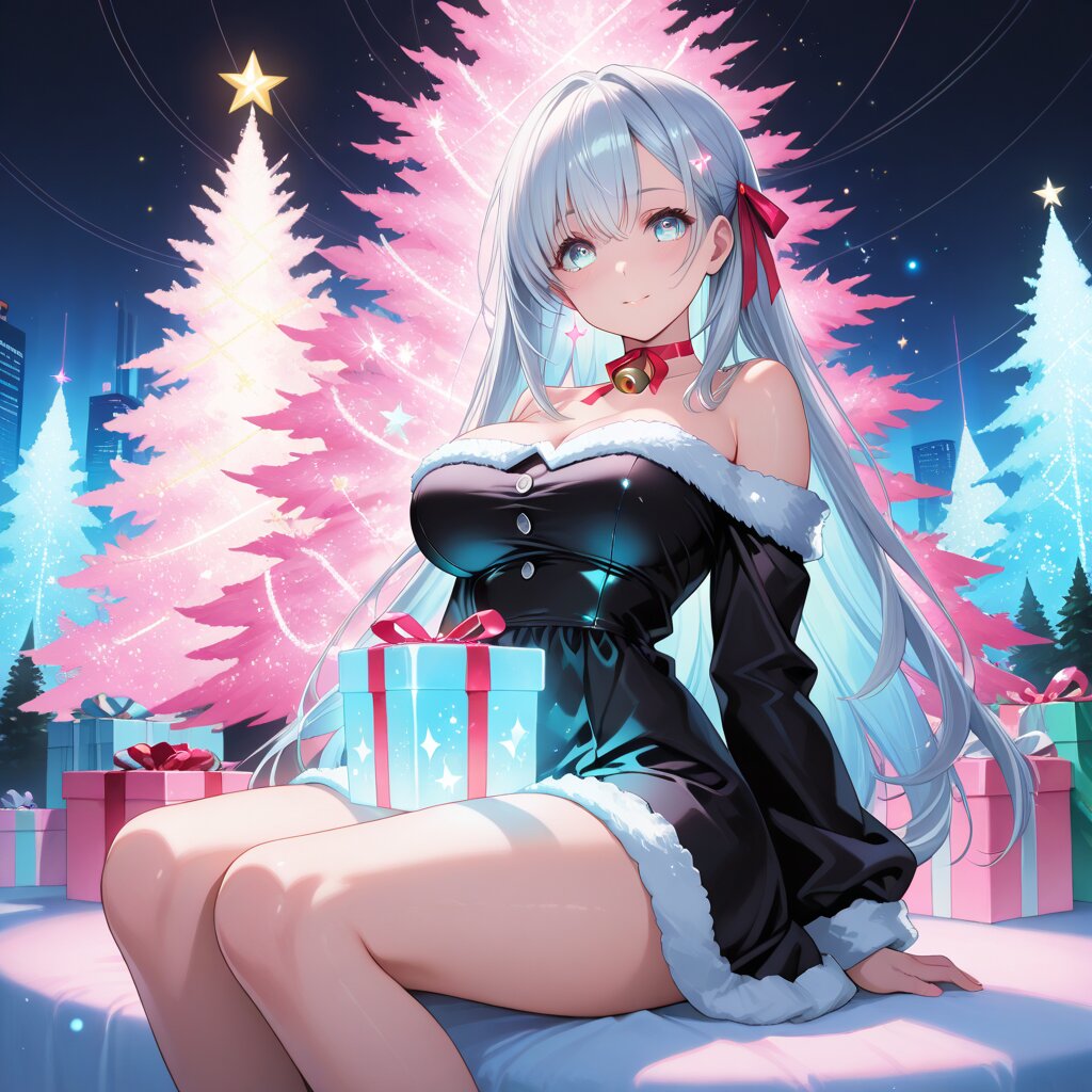 1girl, long silver hair, translucent light blue eyes, large breasts, masterpiece, best quality, ultra high detail, anime style, high resolution, cute neon cyber christmas, sitting pose, facing viewer, centered composition, black santa dress, off-shoulder santa dress, softly glowing neon trim on dress edges, pastel neon glow, cyan and pink glow, round glowing buttons, cute glowing buttons, fluffy fur trim, softly glowing fur texture, futuristic yet cute fabric, softly reflective material, small metallic bell on red ribbon choker, holographic christmas tree, pastel hologram tree, soft wireframe tree, heart and star hologram ornaments, pastel neon christmas lights, floating holographic gift boxes, cute glowing presents, digital snow particles, sparkling light particles, cute cyberpunk city background, pastel neon city lights, softly enveloping light atmosphere, cinematic soft lighting, rim light, dreamy illumination, bloom effect, fantasy mood, pink neon glow, pastel pink and cyan lighting