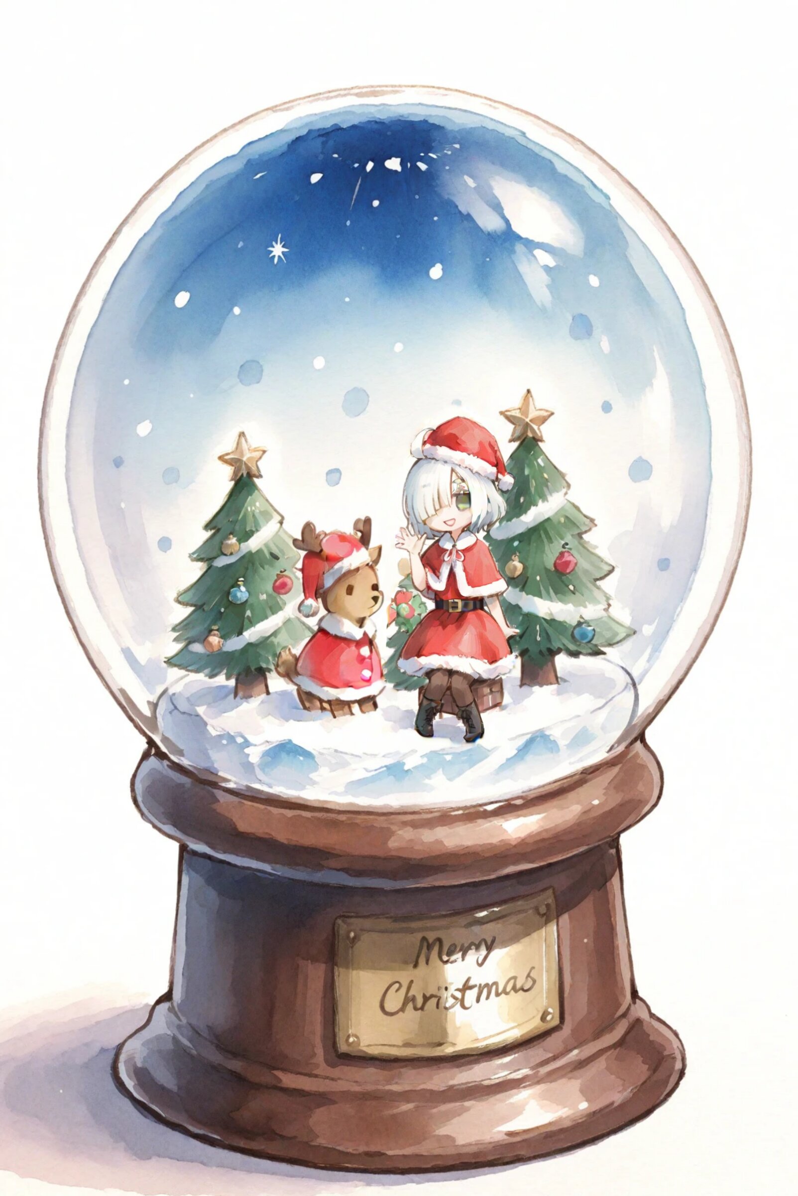 <lora:inmnstyleilxl:0.9>, ultra-detailed, best quality, masterpiece, very aesthetic, watercolor painting, general, 1 girl, chibi, solo, red santa hat, red capelet, fur trimmed capelet, red dress, black waist belt, flare skirt, fur trimmed skirt, brown tights, black lace-up boots, smile, open mouth, looking attention viewer, hand up, (bright white hair), short hair, blunt bangs, white thick eyebrow, white colored eyelashes, (hair over one eye), ahoge, mint green eyes