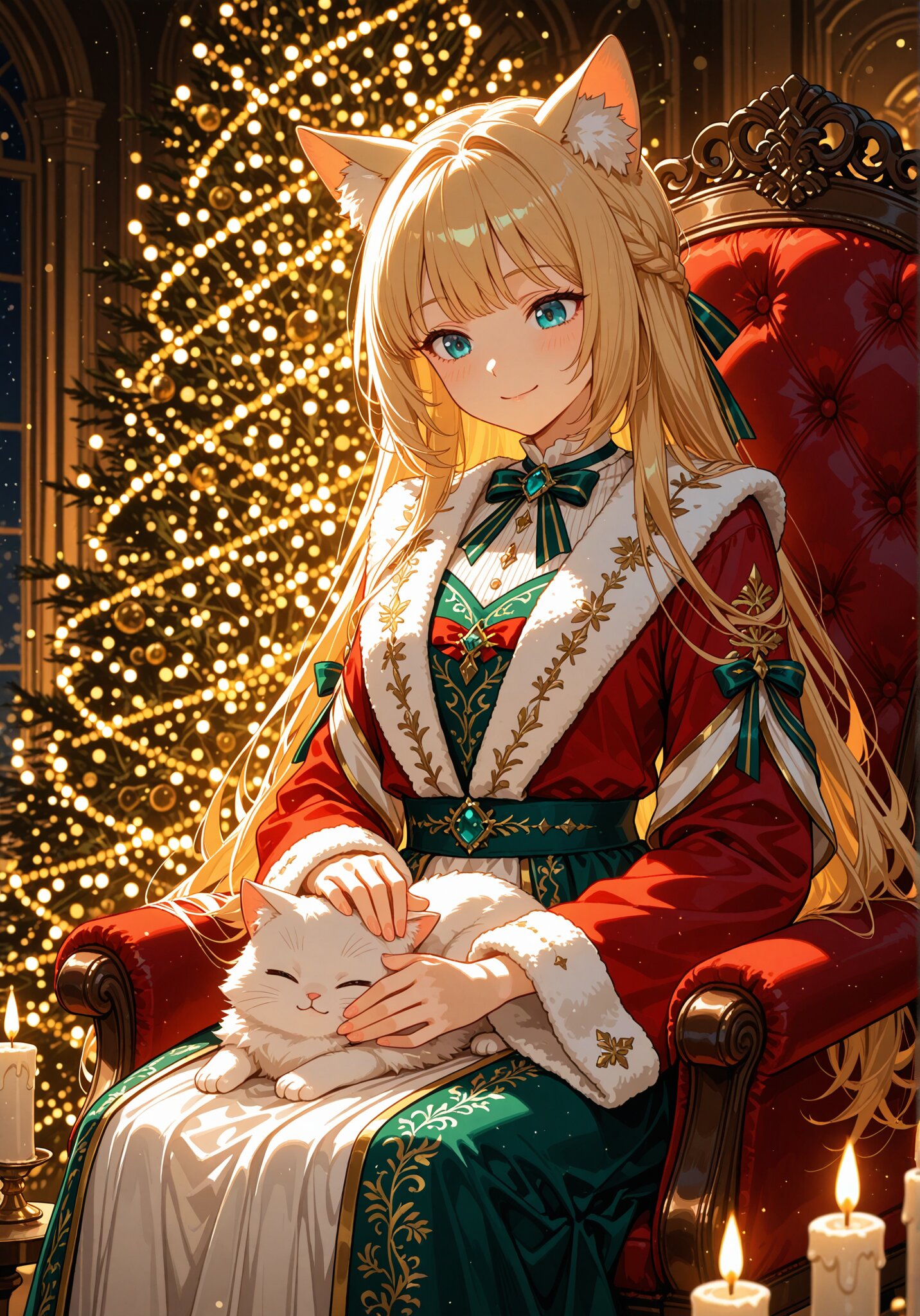 1girl, elegant cat ears, fluffy cat ears, braid, blue eyes, refined noble atmosphere, graceful posture, gentle confident smile, calm gaze, looking down, upper body, sitting on chair, Petting a cat sleeping on your lap, luxurious classical Christmas outfit, long dress, deep emerald and rich burgundy color palette, shiny silk and satin fabric, embroidered with gold thread, decorated with sparkling gemstones and crystals, delicate lace accents, ribbon details, long flowing skirt emphasizing vertical lines, white fur trim with a refined texture, soft glowing particles floating around, sparkling light effects, stardust texture in the air, subtle magical glow surrounding the body, warm Christmas lighting, tall Christmas tree in the background, golden ornaments, candles, soft bokeh lights, cinematic lighting, high detail, refined illustration, vertical composition, fantasy elegance, premium artwork