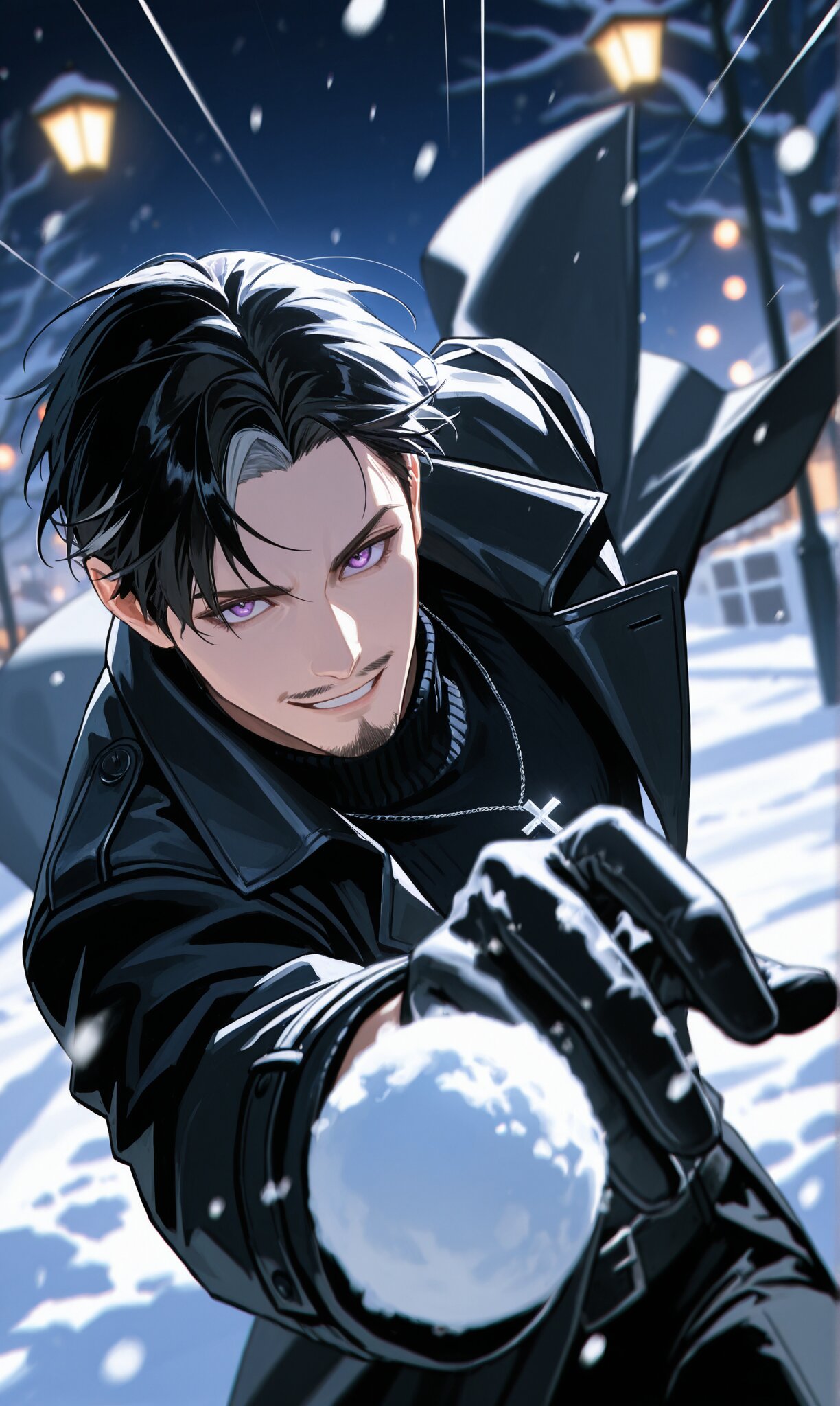 dark and sophisticated atmosphere, cinematic winter night scene, late-thirties Asian man, short black hair with gray streaks, neatly trimmed, thin goatee and mustache, sharp facial features, deep purple eyes, confident smile expression, black turtleneck sweater, glossy black leather trench coat worn open, emphasizing a sleek silhouette, silver cross pendant necklace catching subtle light, wearing elegant black leather gloves with a refined matte texture, snow dust clinging slightly to the gloves, dynamic action pose, overhand throwing motion, arm swung down from above after a full wind-up, shoulders and torso slightly twisted, coat flaring dramatically with the motion, snowball just released, flying toward the viewer, arm extended forward at a downward angle, extreme foreshortening, dramatic perspective, confident smile, intense gaze, looking at viewer, cinematic lighting, high contrast lighting, emphasis lines, motion blur, motion lines, deep shadows, sharp highlights, hard light and rim light outlining the figure, bold chiaroscuro, dramatic shading, winter background at night, softly falling snow, blurred lights and street lamps, cool blue and violet tones contrasting with warm highlights, depth of field, background bokeh, photorealistic style with subtle anime-inspired touches, ultra-detailed, high realism, cinematic composition