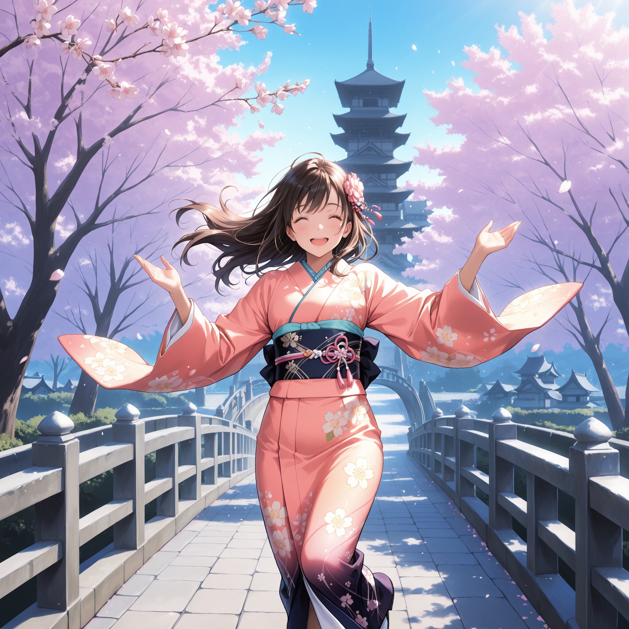masterpiece, best quality, photorealistic, sharp focus, cinematic lighting, depth of field, beautiful composition, vibrant colors, ultra high res, 8K, highly detailed, masterpiece, best quality, very detailed, masterpiece, best quality, anime coloring, 1girl, beautiful hime, wearing a bright floral furisode kimono, holding her kimono skirts high to run, running across a stone bridge in a castle garden, cherry blossoms falling, traditional Japanese castle tower (Tenshu) in the distance, smiling expression, wind blowing through hair and sleeves, vibrant colors, Makoto Shinkai style, emotional lighting.
