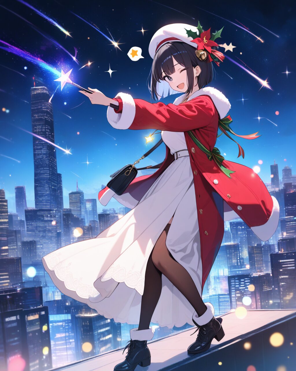 1girl, black straight bob cut, black eyes, one eye closed, white beret, hat flower, long dress, long coat, brown thighhighs, ankle boots, glowing heart necklace, shoulder bag, smile, open mouth, casting spell, holding wand, blue aura, colorful illumination, skyscraper, rooftop, Christmas, starry sky, clear sky, shooting star, BREAK from side, standing, sparkling aura, +++, spoken star, projection mapping, masterpiece, absurdres, high score, great score