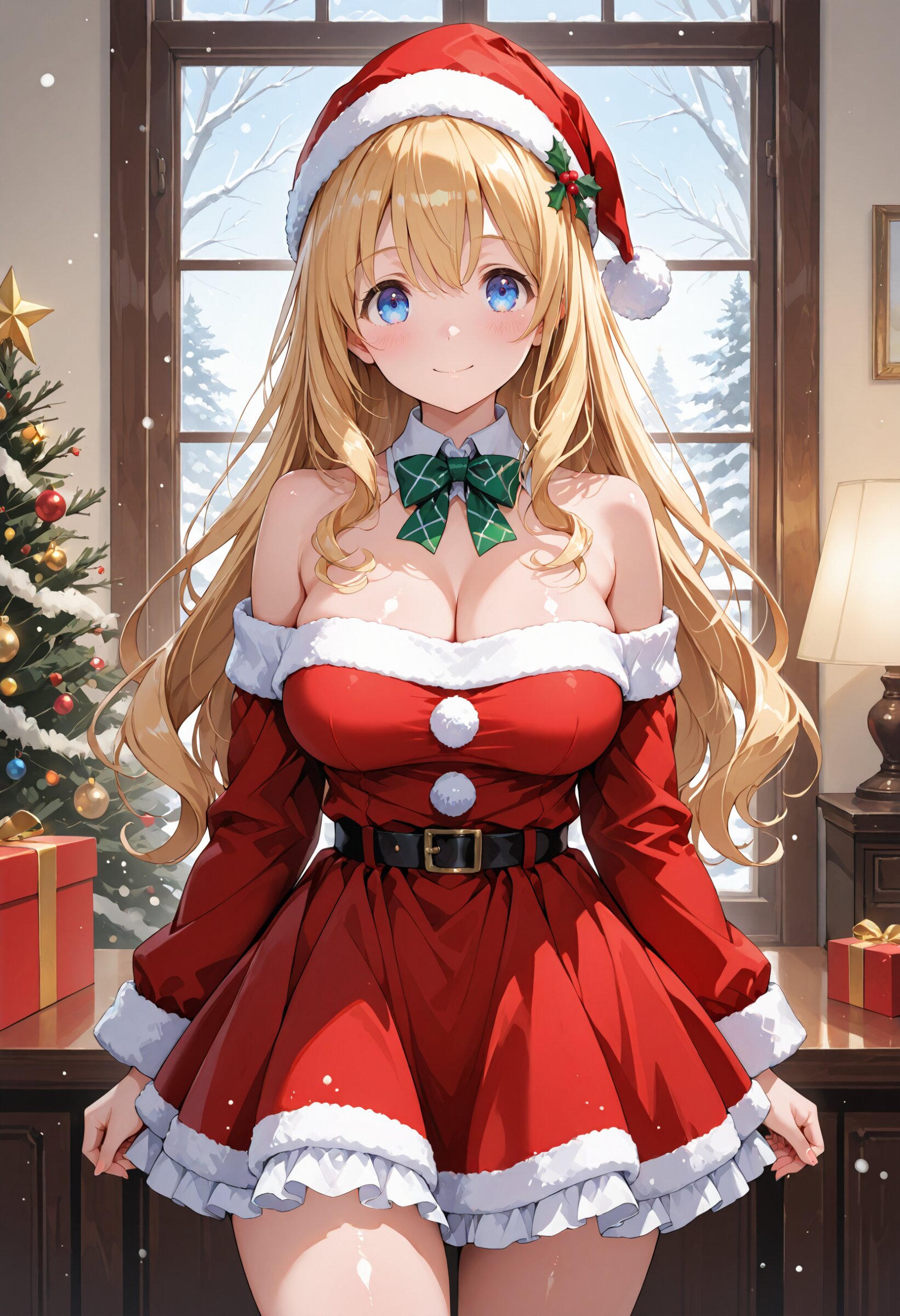 (masterpiece,high resolusion,illustration,ultra detailed 8k art,extremely detailed CG,official art,clothes reflecting light,detailed shiny skin,detailed background:1.3), ((highly detailed beautiful face and eyes)) BREAK 1girl, solo, standing, face_focus, 16-year-old, kawaii, cute_face, tareme, inocent_smile, no_makeup, beautiful_anime_girl, blonde_hair, long_hair, curly_hair, blue_eyes, beautiful_eyes, large_breasts, beautiful_breasts, holding_christmas_present BREAK santa_hat, simple red christmas costume, fake fur, Off-Shoulder, Strapless, flare_dress, long_sleeves, frill_skirt BREAK living_room, window,
