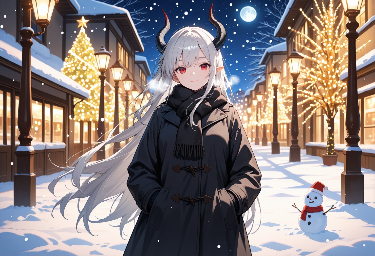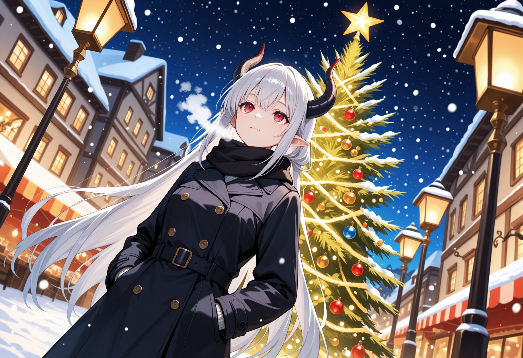 masterpiece,best quality,highres,ultra detailed,highly detailed,8k,general,1girl,solo,17yo,cute,(black dragon horns,demon horns,silver hair, very long hair,bangs, red eyes),slender,long sleeves that cover wrists,medium breasts,dragon ears,pointy ears,light smile,closed mouth,dragon girl,(winter clothes,very long coat,black coat,black scarf),slender girl,hands in pockets BREAK walking,looking up,looking christmas tree,looking away,night,cowboy shot,snow,snowing,in town,illumination,colorful illumination town,many colorful light illumination,many colorful lamp illumination,breath,dutch angle,