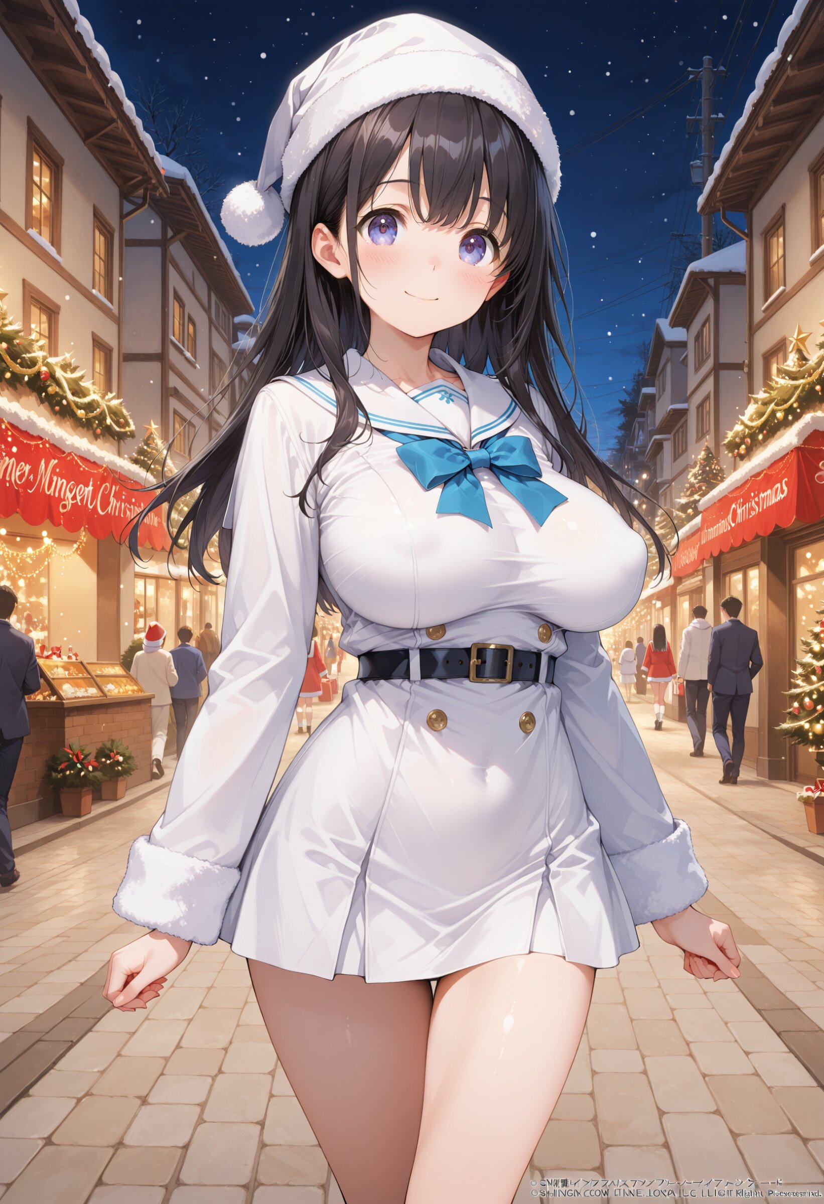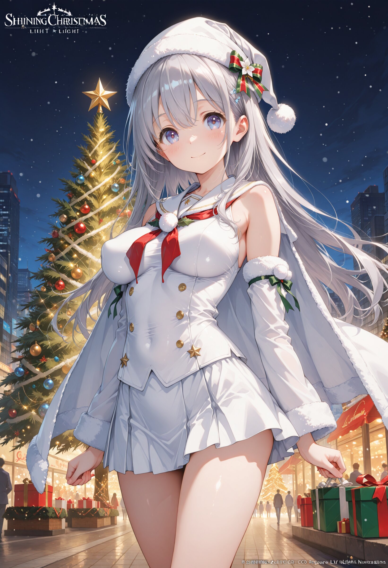 masterpiece, best quality, amazing quality, general, fine detail, official art, 1girl, (loli:1.2), beautiful silver hair, beautiful eyes, white santa costume, white santa cap, white miniskirt, white short cape, detached sleeves, sailor collar, big breasts, perky breasts, impossible clothes, slim legs, slim hip, Christmas party, innocent expression, happy, Urban city square, night, (Shining Christmas illuminations light:1.2), L.E.D. illumination big christmas tree, cowboy shot, look at christmas tree,