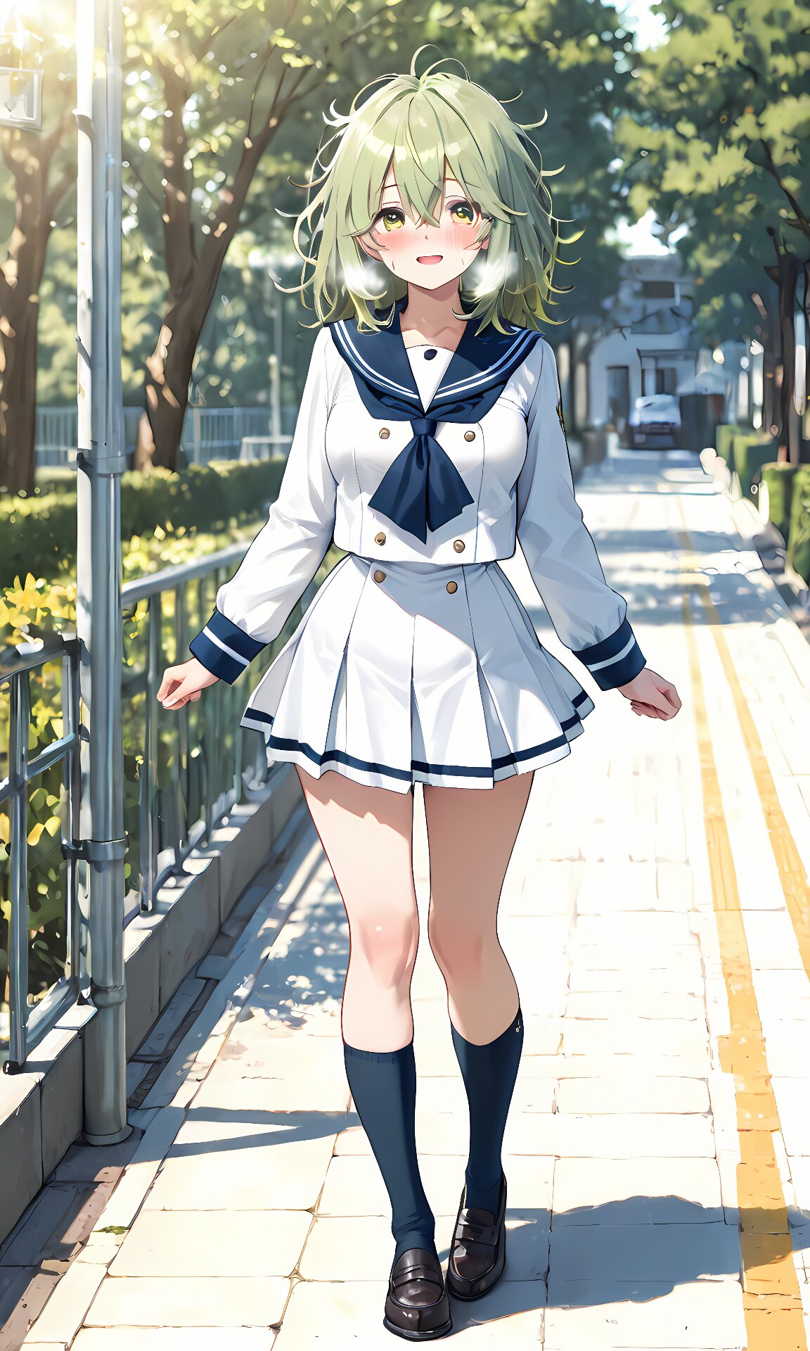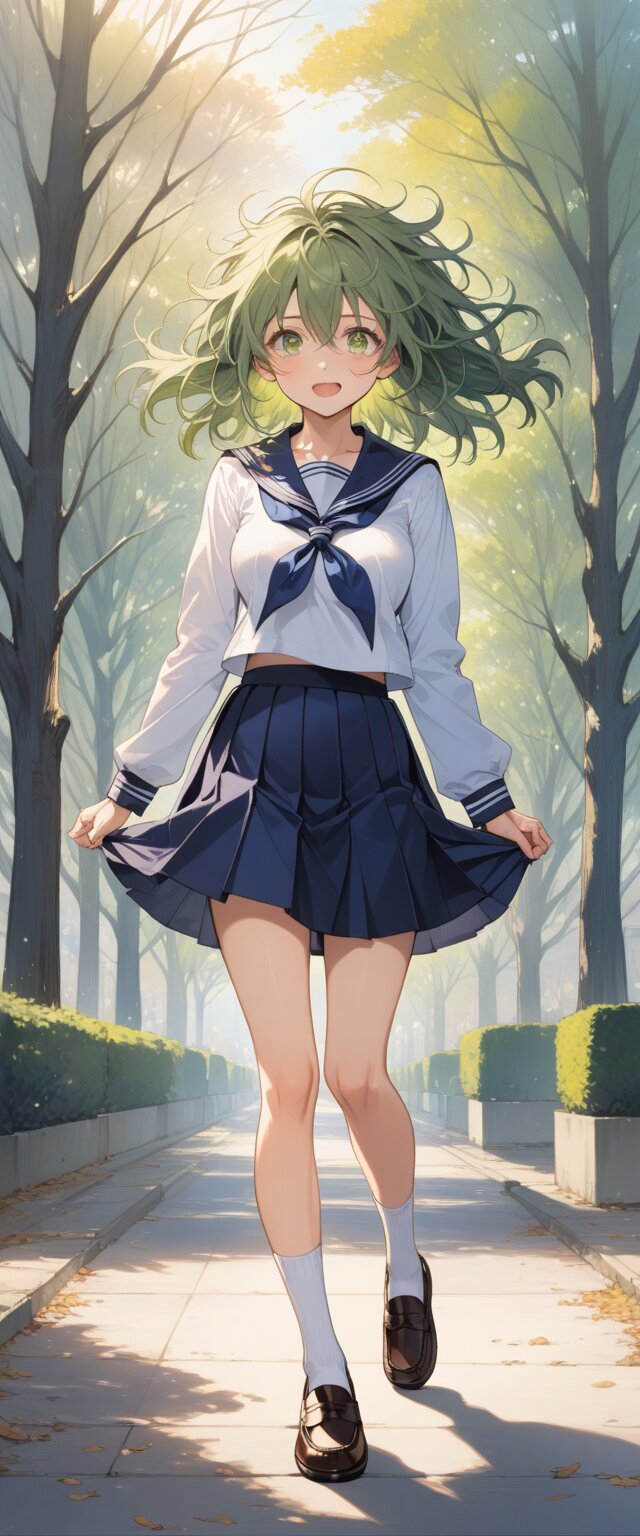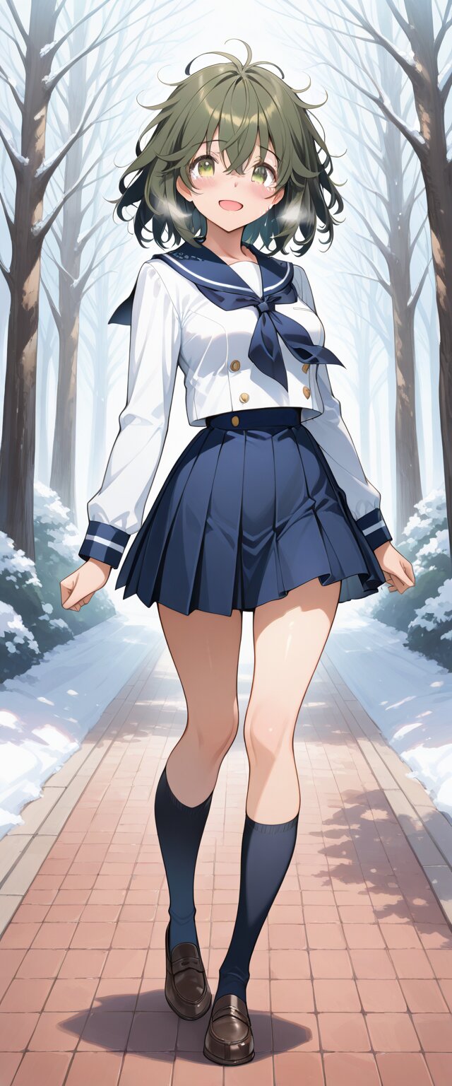 Best quality, Masterpieces, anime schoolgirl in winter scene, white sailor uniform, visible breath, soft sunlight, leafless trees, gentle blush, serene campus background, (((((Full body))))), Female high school student wearing (navy sailor school uniform:1.5), (messy hair:1.5), medium hair, olive-green hair, large expressive yellow-green eyes, flushed cheeks, slightly open mouth, medium breasts, hair between eyes, (beautiful eyes), serafuku, long sleeves, white shirt, pleated skirt, dark blue sailor collar, dark blue neckerchief, sailor collar, pleated skirt, socks, loafers, masterpiece, best quality, {{{{masterpiece}}}}, {{{{school uniform}}}}, light smile, Anime-style illustration drawn with extreme precision. Her hair is swaying in the wind. Tears filled her big and beautiful eyes.