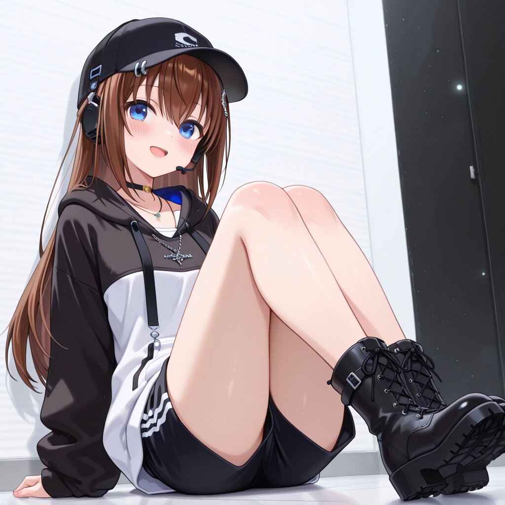 <lora:tokino sola:1>1girl, solo, long hair, looking at viewer, very blush, smile, open mouth, bangs, blue eyes, brown hair, shirt, upper color black under color white shits, long sleeves, hat, hair between eyes, full body, boots, shorts, choker, virtual youtuber, hood, necklace, black footwear, black headwear, hoodie, black shorts, baseball cap, headset, tokino sola, dance studio, upward glance,