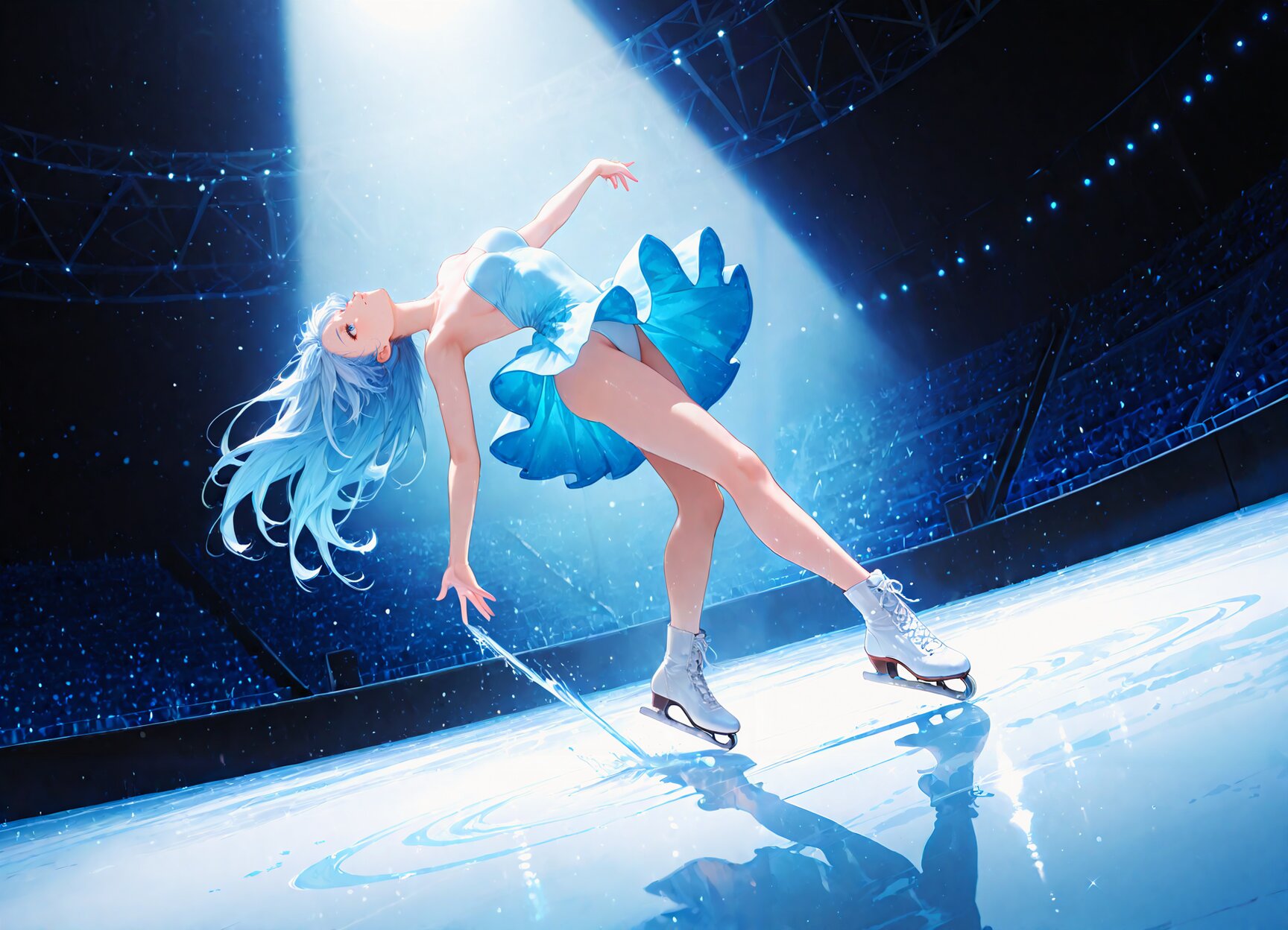 landscape illustration,figure skating rink, female figure skater performing Ina Bauer pose, deep backbend,extreme arching spine,chest facing upward, one leg stretched forward,the other leg stretched backward, both skates on ice,strong edge control, dynamic elegant posture,graceful motion, ice rink reflections,sharp skate blades, flowing skating dress,soft fabric movement, cool blue and white color palette, dramatic lighting,spotlight on skater, ice particles scattering,subtle motion blur, anime style illustration,high detail,clean line art, cinematic composition,wide angle view, Particles of light,complex,Natural Light,Attention to detail,Movie Scenes,detailed background,detailed foreground,depth of field,volumetric lighting,<lora:xl_more_art-full_v1:0.6>,<lora:great_lighting:0.6>,<lora:flat_sdxl:-0.4>,<lora:outline_xl_kohaku_delta_spv5x:-0.4>,<lora:Detailer_NoobAI_Incrs_v1:0.8>,detailed,, appropriate posture,appropriate configuration,ideal ratio body proportions,perfect anatomy, <lora:Fixhands_anime_bdsqlsz_V1:1>, masterpiece,best quality,newest,absurdres,highres,ultra high res,8K UHD,hyper-detailed,, appropriate posture,appropriate configuration,ideal ratio body proportions,perfect anatomy, <lora:Fixhands_anime_bdsqlsz_V1:1>, masterpiece,best quality,newest,absurdres,highres,ultra high res,8K UHD,hyper-detailed,, appropriate posture,appropriate configuration,ideal ratio body proportions,perfect anatomy, <lora:Fixhands_anime_bdsqlsz_V1:1>, masterpiece,best quality,newest,absurdres,highres,ultra high res,8K UHD,hyper-detailed,, appropriate posture,appropriate configuration,ideal ratio body proportions,perfect anatomy, <lora:Fixhands_anime_bdsqlsz_V1:1>, masterpiece,best quality,newest,absurdres,highres,ultra high res,8K UHD,hyper-detailed,