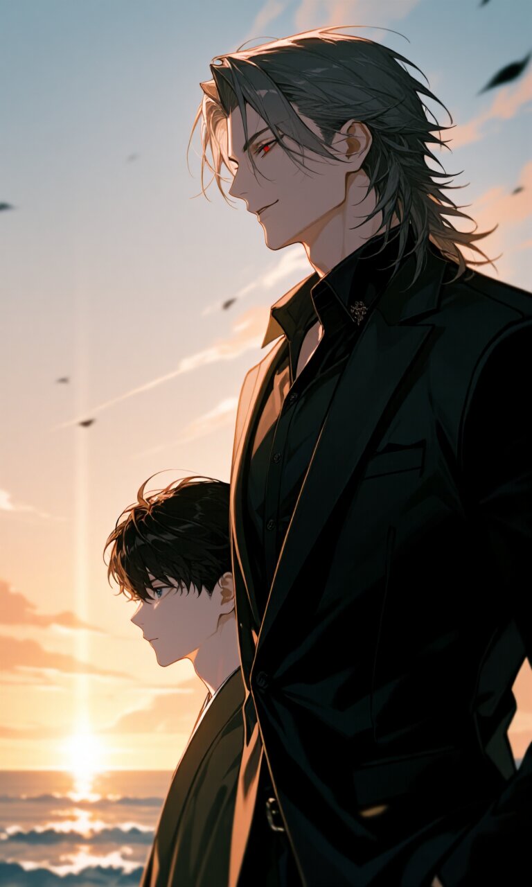 two men side by side full body, delicate and elegant young Japanese man, short soft black hair slightly parted to the side, pale skin, calm thoughtful expression full body, dangerously alluring mature Chinese man, 36 years old, long layered grayish-black hair swept back, sharp red eyes with a confident smile, fitted black tuxedo jacket over an open-collar black silk shirt, subtly revealing muscular chest standing on a seaside cliff bathed in the first sunrise of the year, golden light spilling across the ocean horizon, soft morning mist, gentle wind moving his clothing, a serene and powerful new beginning mood, wide-angle cinematic composition, luminous sky gradients of peach, gold, and pale blue, ultra-detailed anime style, crisp atmospheric lighting,looking far away,
