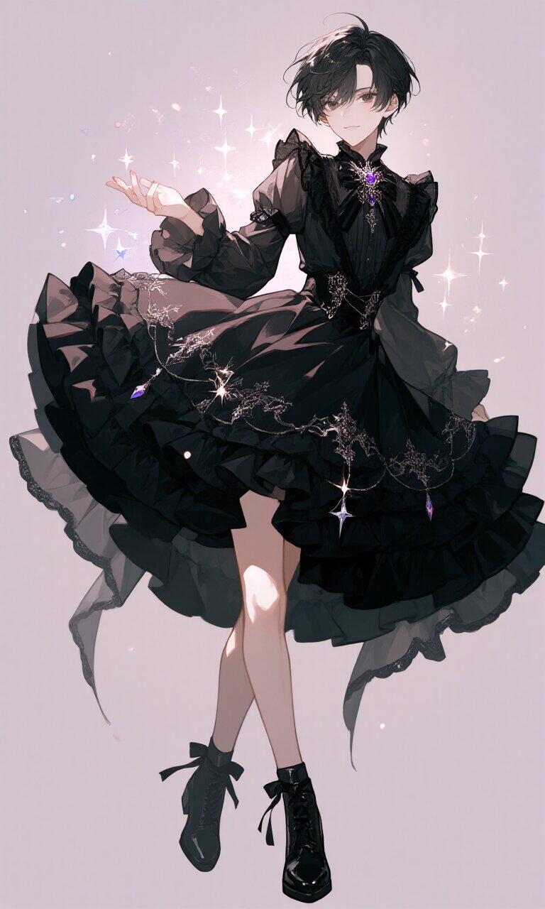 full body, delicate elegant young Japanese man, soft black hair,dark eyes,pale skin,brown eyes, wearing Gothic lolita black lace dress, ultra-detailed anime style with stylish composition, Sparkle star surround his body like magical girl changeing-mood style,