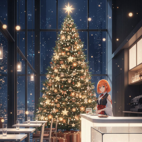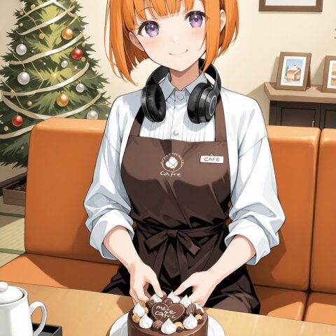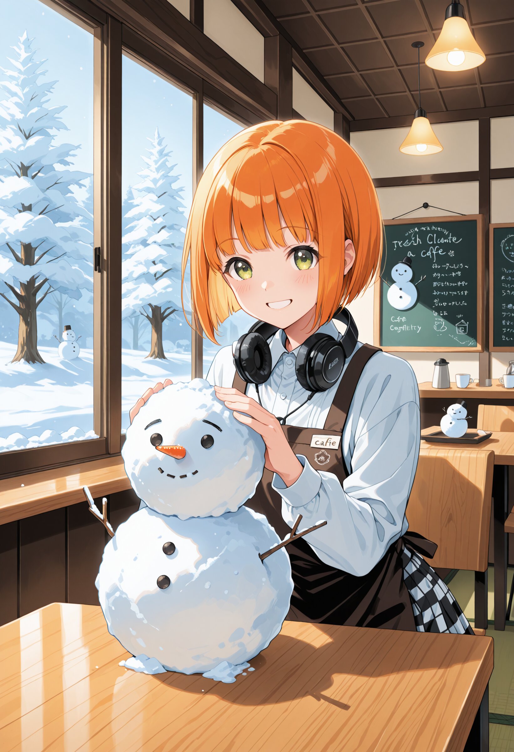 A bright and refreshing winter morning scene centered around a Japanese modern café, filled with playful winter energy and soft snowy light. Outside the large glass windows, gentle snow falls, with snowmen, snow art, and traces of snow play visible on the ground — slightly whimsical and cheerful. Inside the café, the floor features a clean ichimatsu checkered pattern, with refined Japanese-modern table seating (no tatami), creating a calm yet stylish space that contrasts with the fun winter scenery outside. Behind the counter stands Zena, smiling warmly as she welcomes guests. She has her signature orange bob-cut hair, headphones resting around her neck, and an idol-like presence that feels friendly and approachable rather than glamorous. Zena wears a Japanese-modern barista uniform, tastefully blending tradition and contemporary café style. Her outfit includes elegant shoulder slits and a stylish mini skirt, balanced to remain professional, cozy, and safe-for-work. On the counter are playful winter details: a cup topped with foam art shaped like a snowman, small snowball-shaped sweets, and doodles of snow animals on the café chalkboard — adding a light comedic and heartwarming tone. Soft winter sunlight reflects off the snow outside, creating transparent highlights, gentle glow, and airy clarity throughout the café. The atmosphere feels lively yet soothing — a moment where winter playfulness meets calm hospitality. High-resolution, natural light photography style, soft reflections, clean composition, Nordic-inspired transparency, Japanese-modern aesthetics, winter play mood with subtle humor, fresh and uplifting ambience.