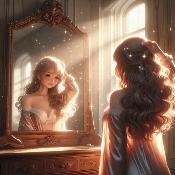 [Meisterwerk, wunderschön, beste Qualität, 8K] In einem einsamen, leeren Zimmer steht eine Kommode und eine schöne Frau vor dem Spiegel. Sie legt die Hand auf ihren Kopf und tätschelt ihn, während sie sagt: „Braves Mädchen, braves Mädchen.“ Es ist eine Geste der Dankbarkeit und Selbstbelohnung. Wunderschönes Sonnenlicht strömt mit Lichtpunkten durch das Fenster. Eine sanfte und niedliche Szene im Anime-Stil.