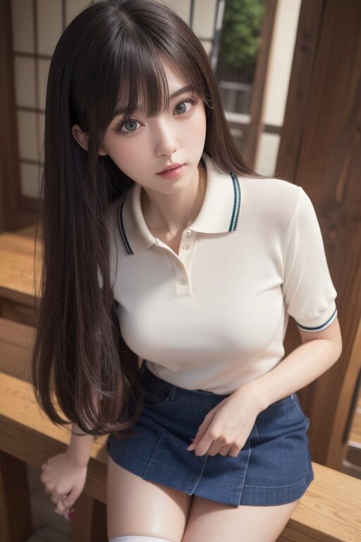 masterpiece, hyper detailed, 8K, hyper detailed illustration, Japanese woman, 23yo, (cute:1.1), (pretty:1.1), hyper detailed face, hyper detailed eye, beautiful eye, medium hair,(bangs:1.1), thin, tall,170cm tall, polo shirt, short skirt, kneehighs, hyper detailed, extremely detailed,