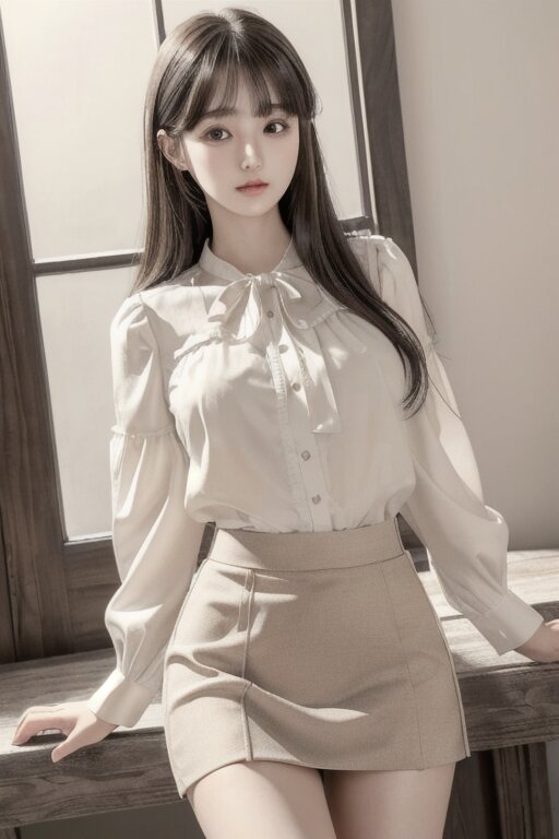 masterpiece, RAW photo, hyper detailed, 16K, Japanese,23yo, woman, cute, pretty, perfect proportion, hyper detailed eye, hyper detailed face, medium hair, bangs, thin, tall, blouse,short skirt, hyper detailed background,