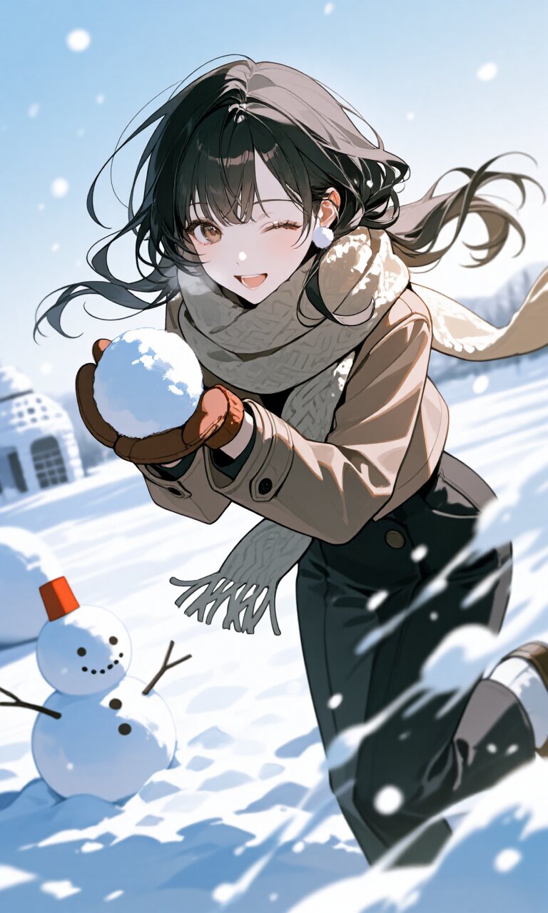full body, delicate elegant Japanese girl,soft black hair, pale skin, slightly playful smile, brown eyes, snowball fight moment, soft powder snow scattering around her, a small snowman and igloo (kamakura) nearby, cheerful winter play mood, bright clear sky, fresh white snow field, warm knit scarf and gloves, dynamic pose, energetic yet graceful, clean anime style with crisp lines and soft winter colors
