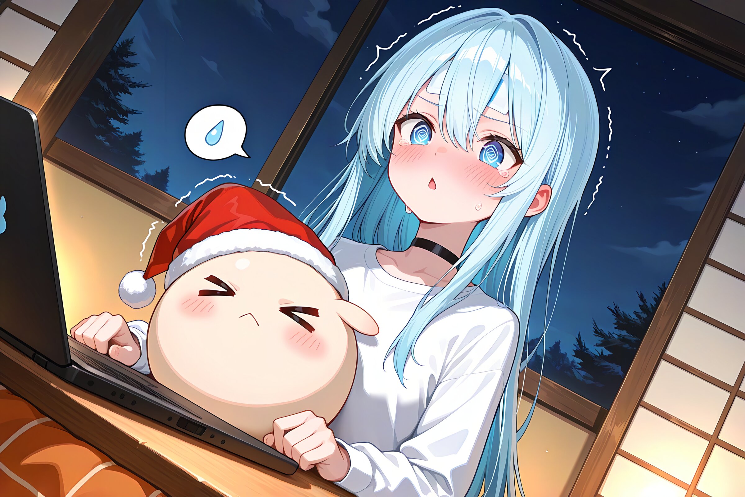 1 little girl, solo, diagonal angle, upper body, masterpiece, best quality, amazing quality, very aesthetic, sky blue hair, long hair, straight hair, blue eyes, hair between eyes, @_@, chestnut mouth, angry, troubled, confused, tearful, blush, trembling, sweat, flying sweatdrop, spoken sweatdrop, choker, white shirt, long sleeves, losed neck, cold pack, sitting, laptop printed rabbit mark, humpty dumpty, > <, japanese room, night, chiristmas, santa hat on kotatsu,