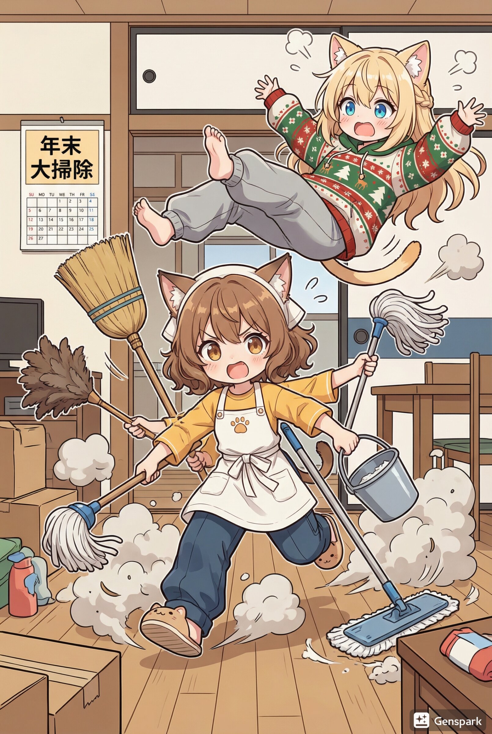 大そうじニャアア! Yuki 2025/12/28使用したAI Gemini/Nano Banana 年齢制限 全年齢 いいね11 シェア #鈴瑠音ミミ #AIゆく年くる年 #年末大そうじ #大掃除 今年のよごれをやっつけろ♡ プロンプト 添付画像の茶髪の子が掃除道具をたくさん持って、家の中を大掃除している様子を面白おかしく描いて。金髪の子は吹っ飛ばされている。金髪の子の服はさっきまで家の中でごろごろだらだらしていたような年末の服装にして。 ネガティブプロンプト Steps Scale Seed Sampler Noise Strength コメント 送信 Yuki 2025年6月より活動開始 221投稿46フォロー51フォロワー 猫耳推しの初心者です🐾 フォローする 他の作品 全てを見る 真実はいつもひとつ!🐾 おやつで乾杯🐾 君と、氷の音 我が家の猫鍋 お鍋のじかん🐾 かえりみち 雪の日の夜遊び 上手にできました~! 聖夜の静寂 ねこサンタのクリスマス大作戦🐾 祝福の星矢 ドーナツのイヴ+他1本 イヴのおたのしみ🐾 にゃーんと召し上がれ! 蛍/lumineコス✨ スイープコス🧙♀️ 冬至とうちの子 トナカイ花凛ちゃん もっと見る