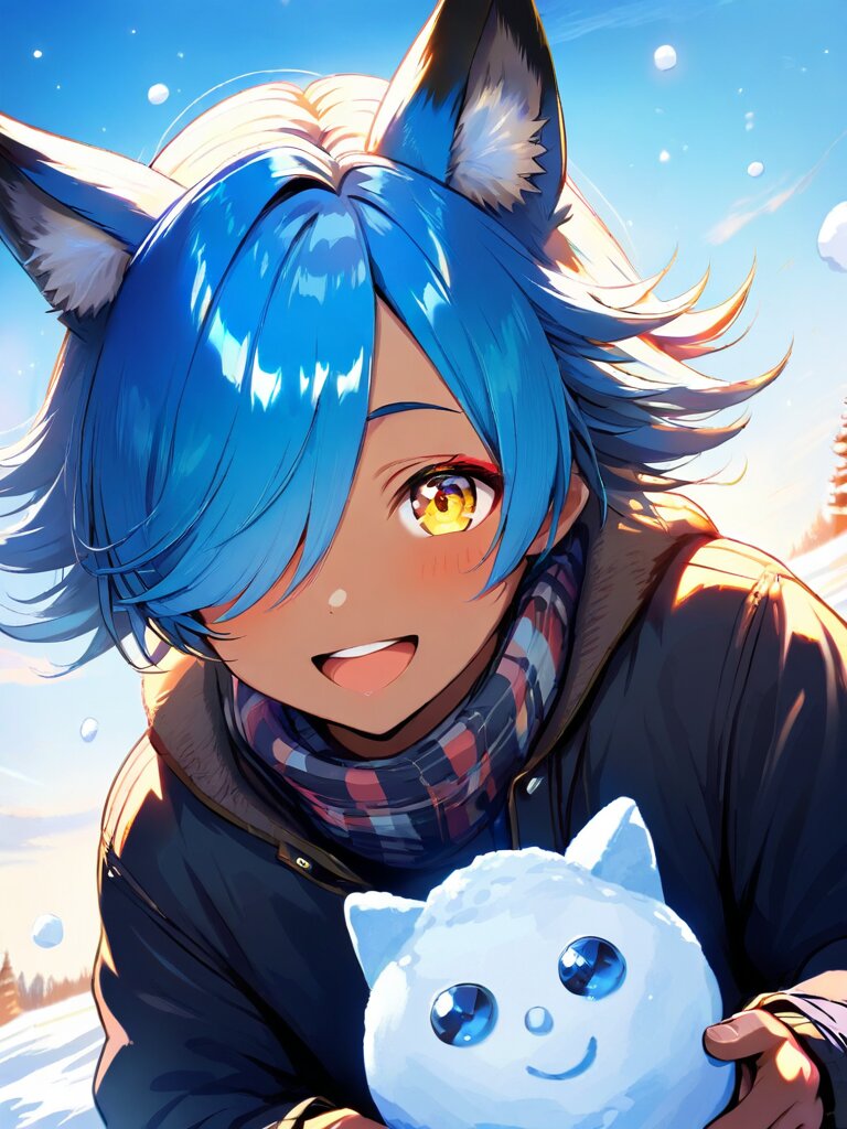 Build a snowman, happy, male focus, boy, shota, fox ears, golden amber eyes, bright sky blue hair, tan skin, hair over one eye, short flipped hair,
