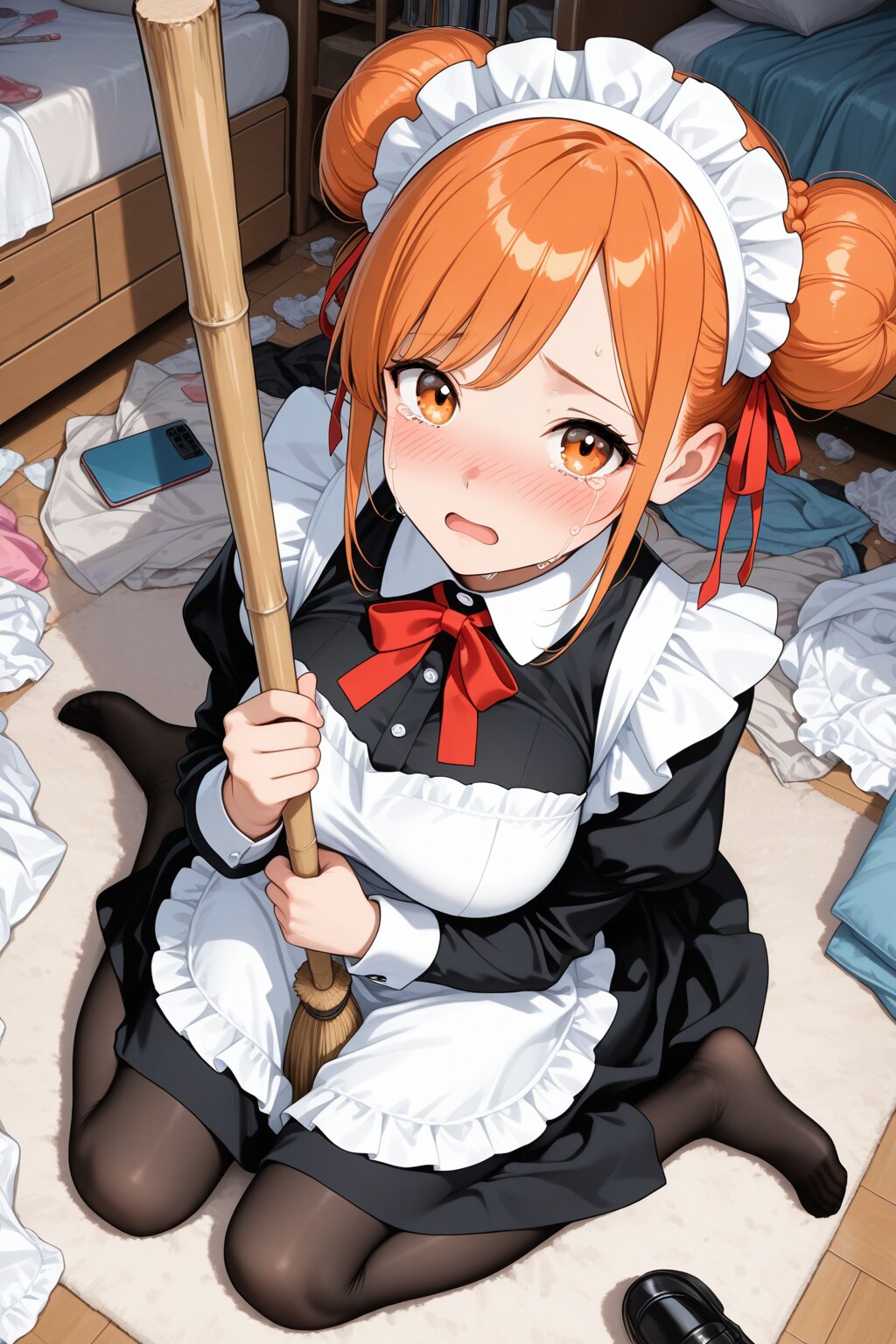 1girl, (messy room),living room, large breasts, orange hair,(double bun),(parted bangs:1.3),sideburns,hair side red string ribbon,swept bangs,center flap bangs, small orange eyes, nose blush,open mouth,crying,sad, maid,white maid headdress,white apron,black pantyhose, sitting,wariza,holding broom, full body,dynamic angle,looking at viewer,from above:0.8,wide shot, ((best quality)),amazing quality,((very high resolution)),very aesthetic,((ultra detailed)),absurdres, full color,extremely detailed CG,super fine illustration, perfect anatomy,perfect hands,super detailed skin, (beautiful eyes,detailed eyes,perfect eyes,eye reflection),high-quality face,extremely detailed face, anime style,