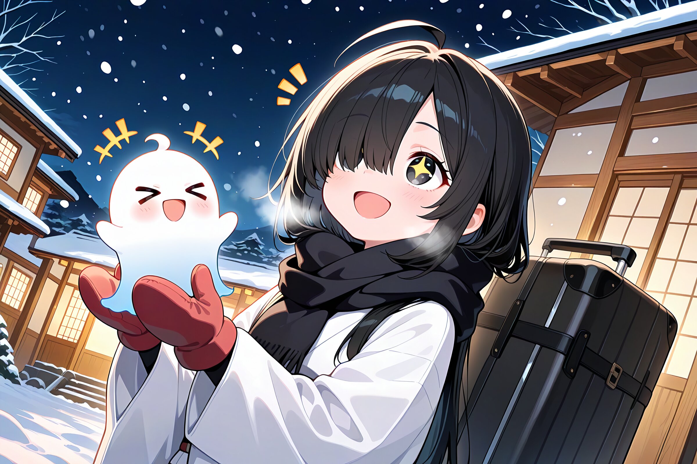 1 little girl, solo, diagonal angle, upper body, from below, masterpiece, best quality, amazing quality, very aesthetic, black hair, long hair, ahoge, (hair over one eye:1.2), black eyes, +_+, open mouth, smile, cheerful, +++, notice lines, choker, white kimono, winter coat, black scarf, mittens, looking up, ghost, > <, japanese old house, rolling suitcase, snow, snowing, night,