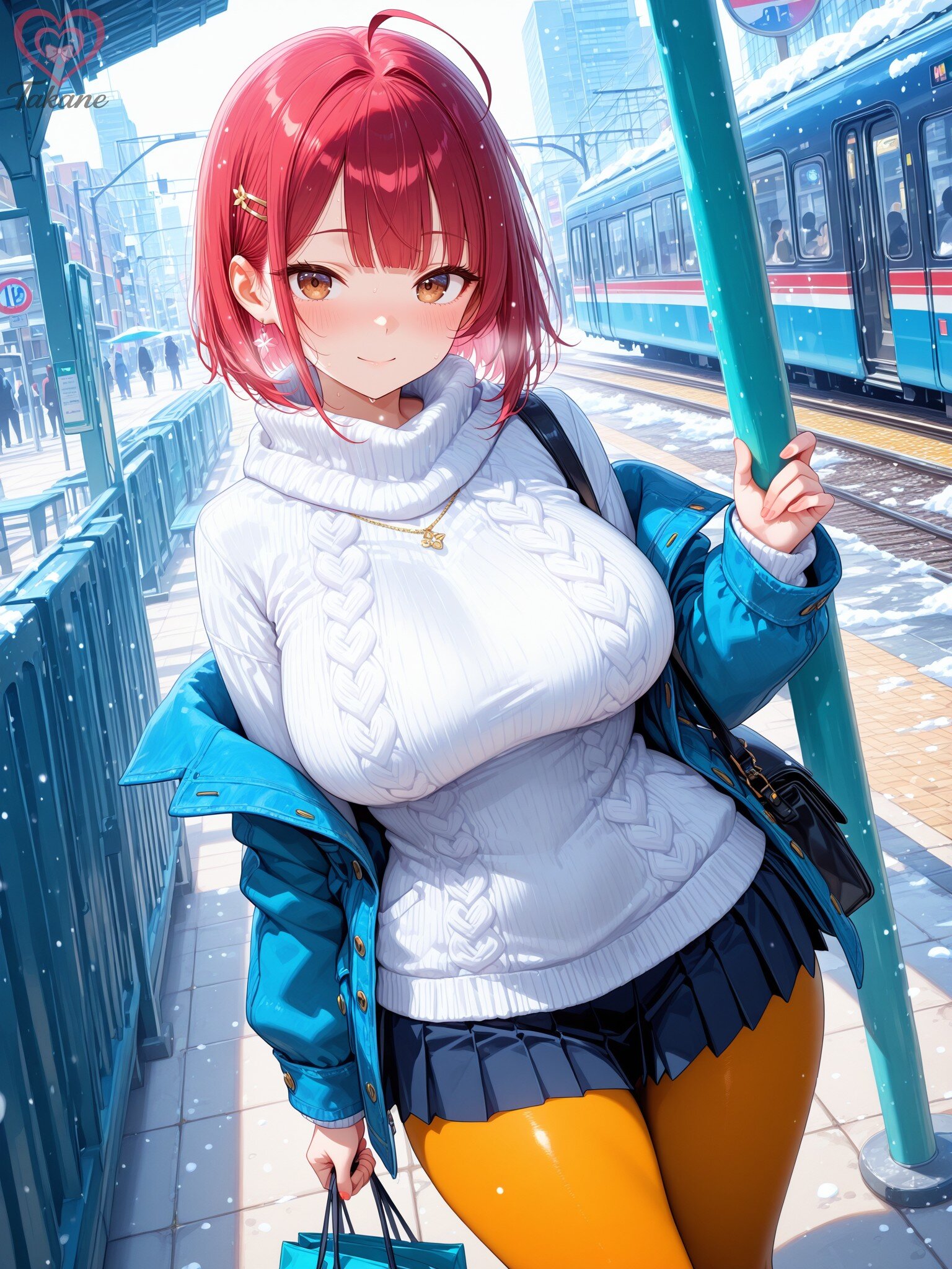 oversized cozy knit sweater, pleated skirt, warm tights, busy shinkansen platform scene, people wearing winter coats and masks boarding a white bullet train, passengers holding suitcases and travel bags, uniformed station staff assisting near the doors, yellow tactile paving on the platform, overhead signs displaying train schedules, modern station roof structure with lights and beams,