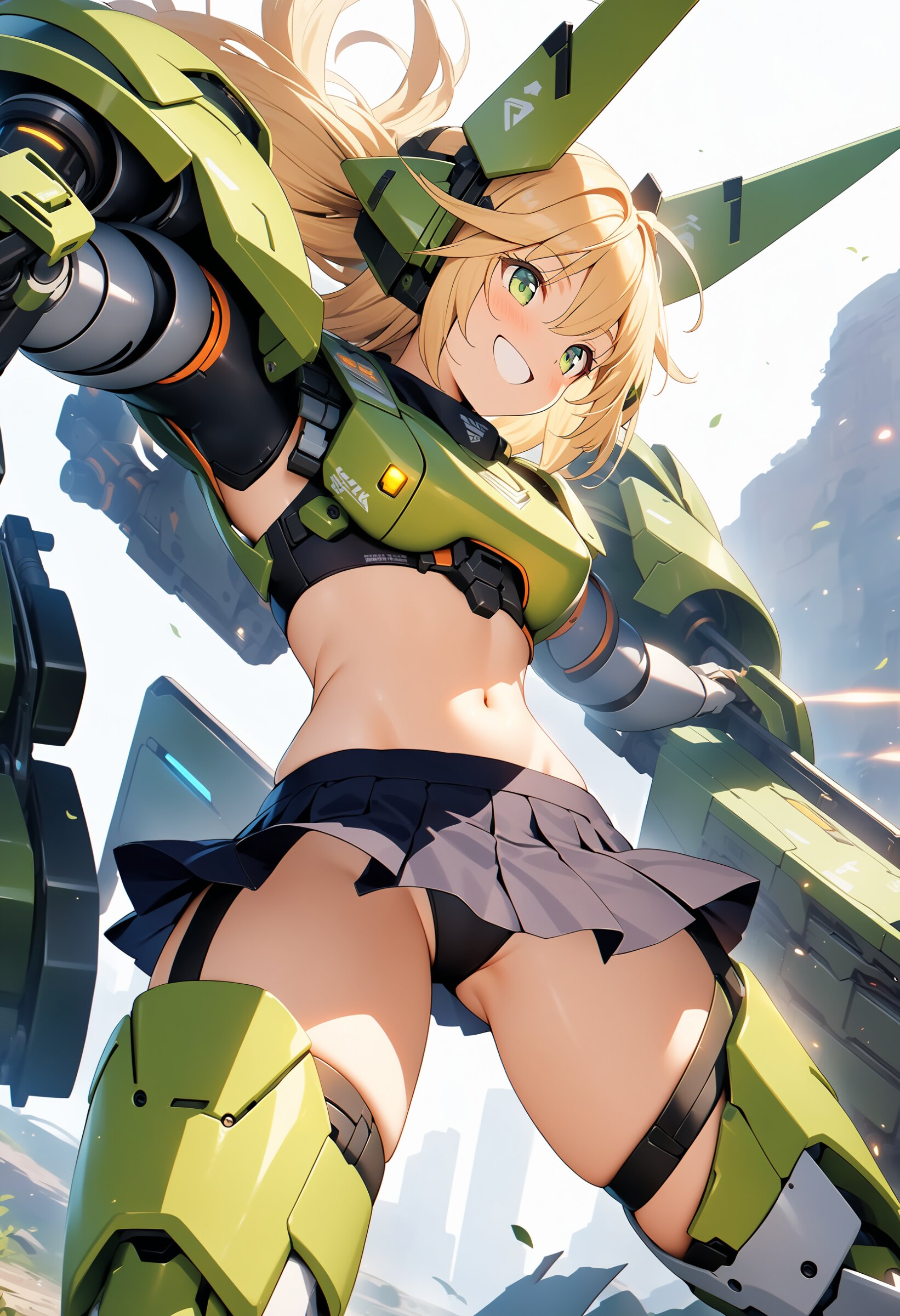 1girl, ((white background)), ultra detailed 8k cg render, masterpiece, high resolution, extremely detailed, mecha musume,mecha shoulder, mech leg, headgear, mecha armor, ((mini skirt)),long blonde hair, dropping green eyes, smile, dynamic posing,