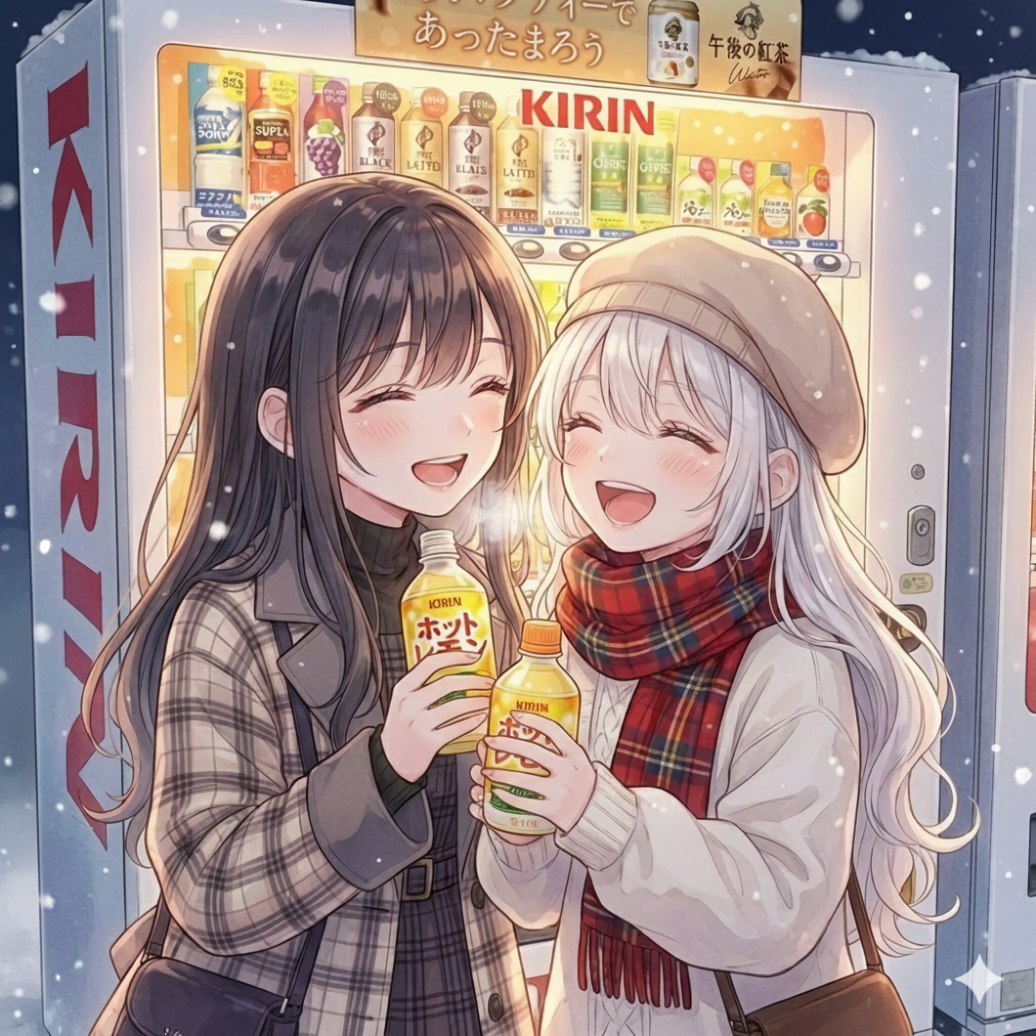 キャラは用意しています。女性の年齢は共に14歳。 2人が自販機の前で温かいホットレモンを持って温まりながら、楽しそうにくっついて談笑している可愛らしい構図。 雪が少し降っていて、自販機の優しい光が2人を照らす。 高精細。アニメ風。 クローズアップのポートレート。ミディアムショット。 **極度に繊細な線画**, **細い線** **柔らかな陰影,非常に綿密な,複雑なディティール** **淡い水彩,透明感のある水彩,柔らかな水彩** (masterpiece,best quality:1.4)、高解像度。 サブサーフェススキャタリング、柔らかな光、自然光、ゴールデンアワーの光 、暖色系のトーン。 自販機とペットボトルは画像を参照し、超精巧なデジタルペインティング風で日本語も完璧に描写してください。 ダイナミックアングル。