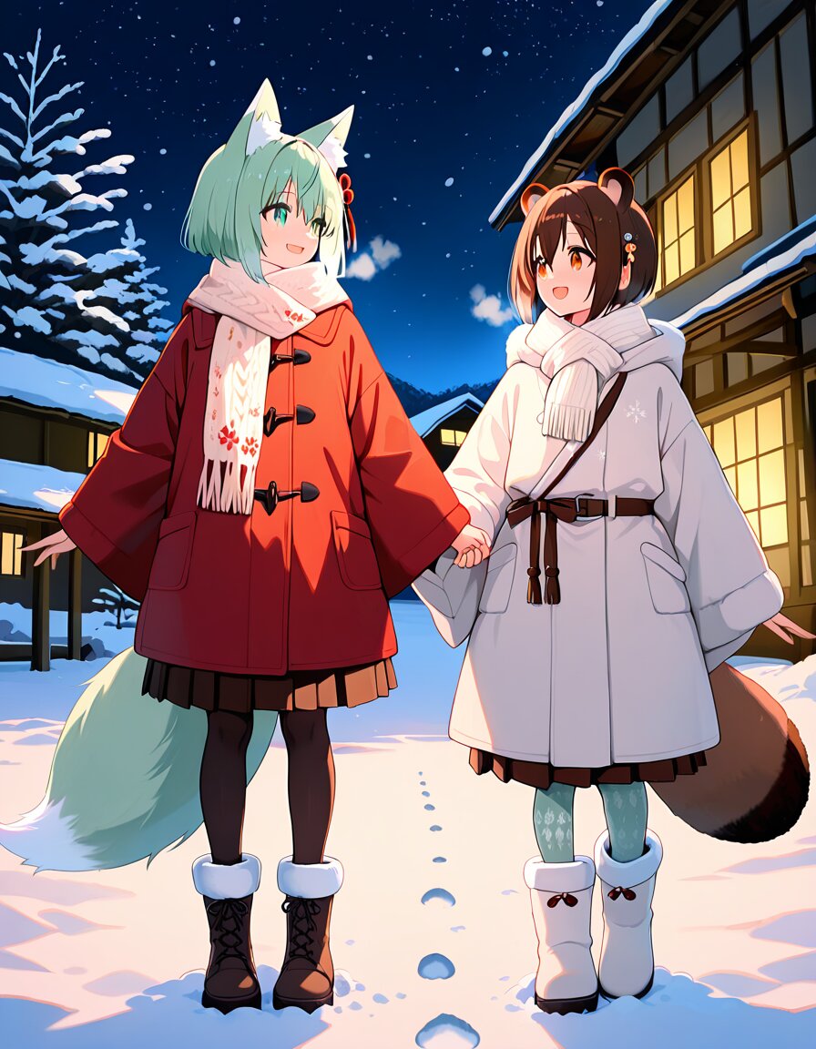 two girls, kemonomimi, fox girl with mint green short bob hair, green eyes, fluffy fox ears and tail, tanuki girl with brown bob hair, warm colored eyes, round ears and fluffy tail, holding hands, looking at each other, smiling, winter outfit, red duffle coat, white long coat, scarf, boots, tights, snowy village at night, falling snow, footprints in snow, traditional japanese houses, warm window lights, anime illustration, soft lighting, cinematic, high detail, clean lineart
