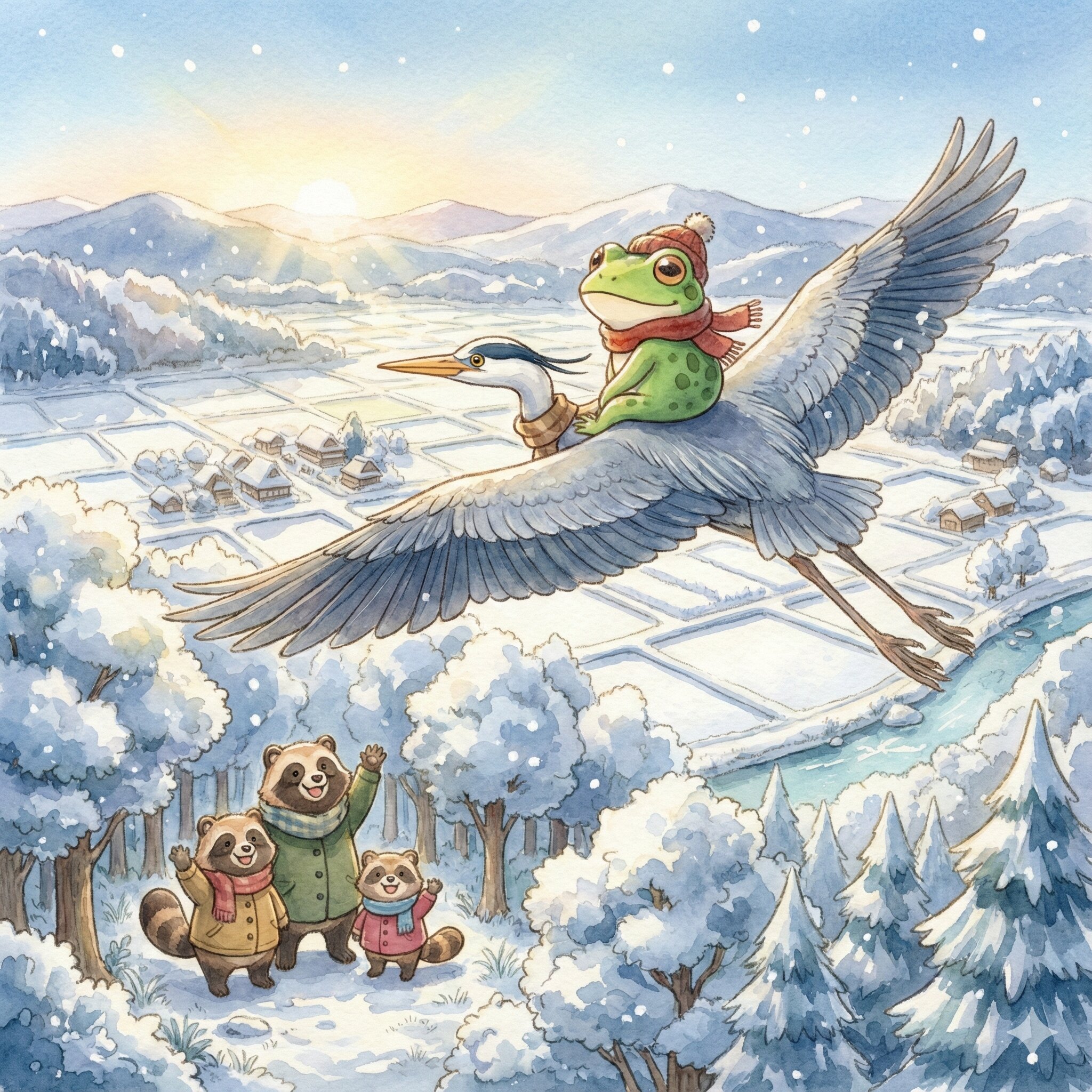 天敵だったアオサギさんの背中に乗って久しぶりに故郷へ帰ります。
