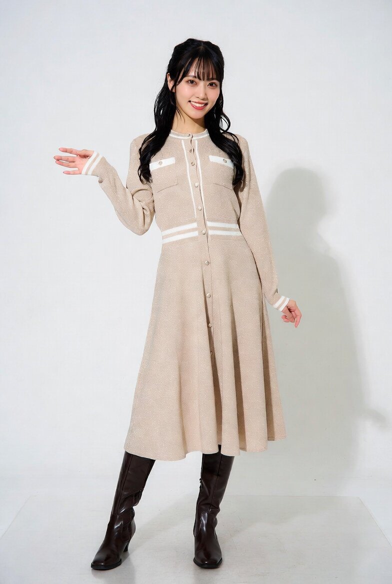 ニット・ワンピース・ドレス・ベージュ。ファッションモデルによる商品紹介風。