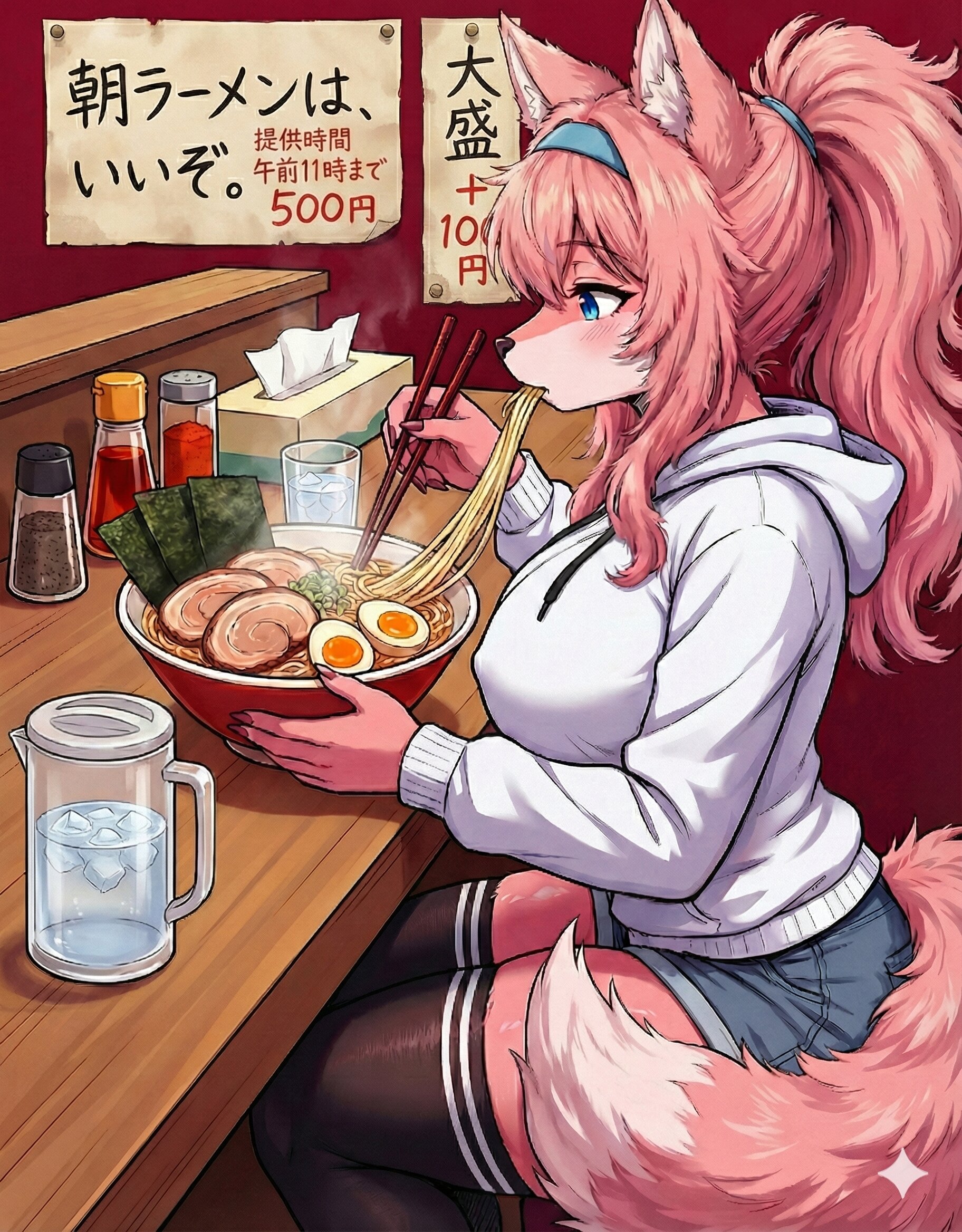 イラストのキャラクターをGペンでペン入れする。2D。カラー。強めの影とコントラスト。線は細く薄くする。バストとヒップがとても豊満。参照イラストのキャラクターをそのまま使ってポーズを変更。毛並みはモフモフ。背景は紅色で、中華風の雲が金箔で入っている。黒タイツの質感向上。キャラクターを側面から見る。ショーツはデニム製。キャラクターが漆器の箸を使い、湯気の立つ大盛りのラーメンを啜っているイラスト生成。ラーメンの食器は赤く、手前に長く延びた木製のテーブルに置いてある。チャーシュー三枚と海苔三枚と味玉二個が載っている太麺のラーメン。食器の奥に胡椒、辣油、唐辛子の粉末、ティッシュ箱が置いている。グラデーションを追加。 ▶︎ 食器の隣に氷水の入ったガラスのコップ、蓋の閉まっている氷水の入った水差しが置いてある。背景の金箔の雲を消去。背景に古めかしい紙が画鋲二個で上部を留めており、二段落に分けて横書きで「朝ラーメンは、いいぞ。」と墨で書かれている。「いいぞ。」の隣に朱色の墨で二段落に分けて「午前11時まで 500円」と書かれている。 ▶︎ 「午前11時まで」の上に「提供時間」と追記。「朝ラーメン」の紙の隣に、縦書きで「大盛+100円」と墨で書かれた古めかしい紙が上下に画鋲で一個ずつ留められている。「+100円」の部分は朱色の墨。